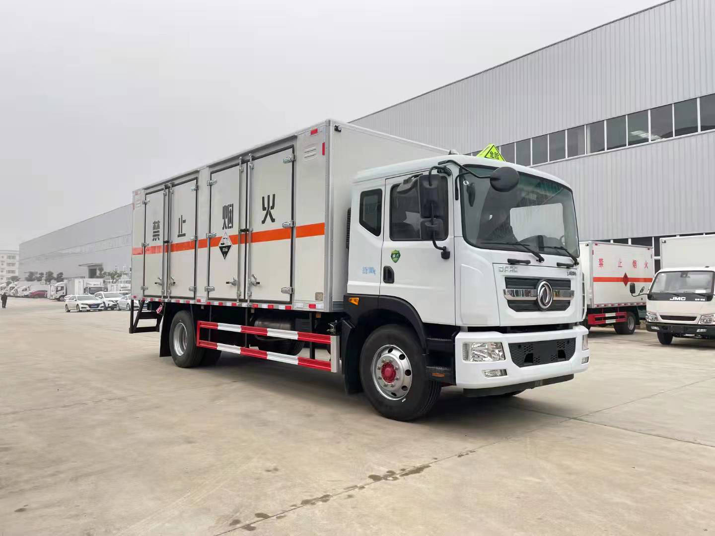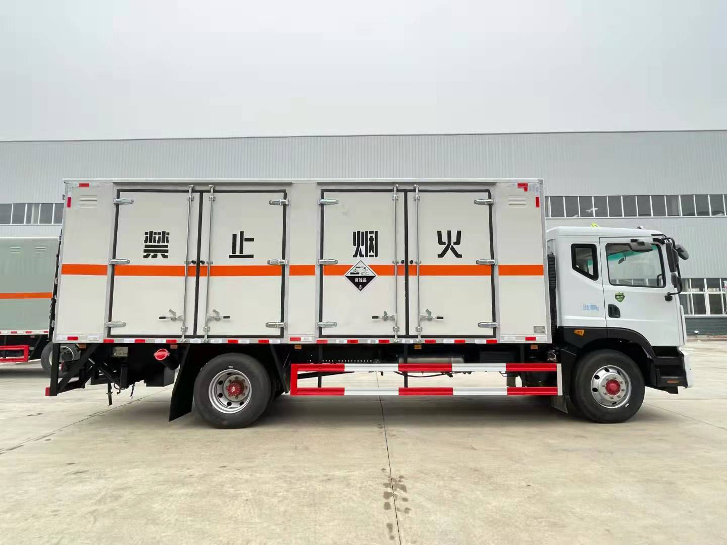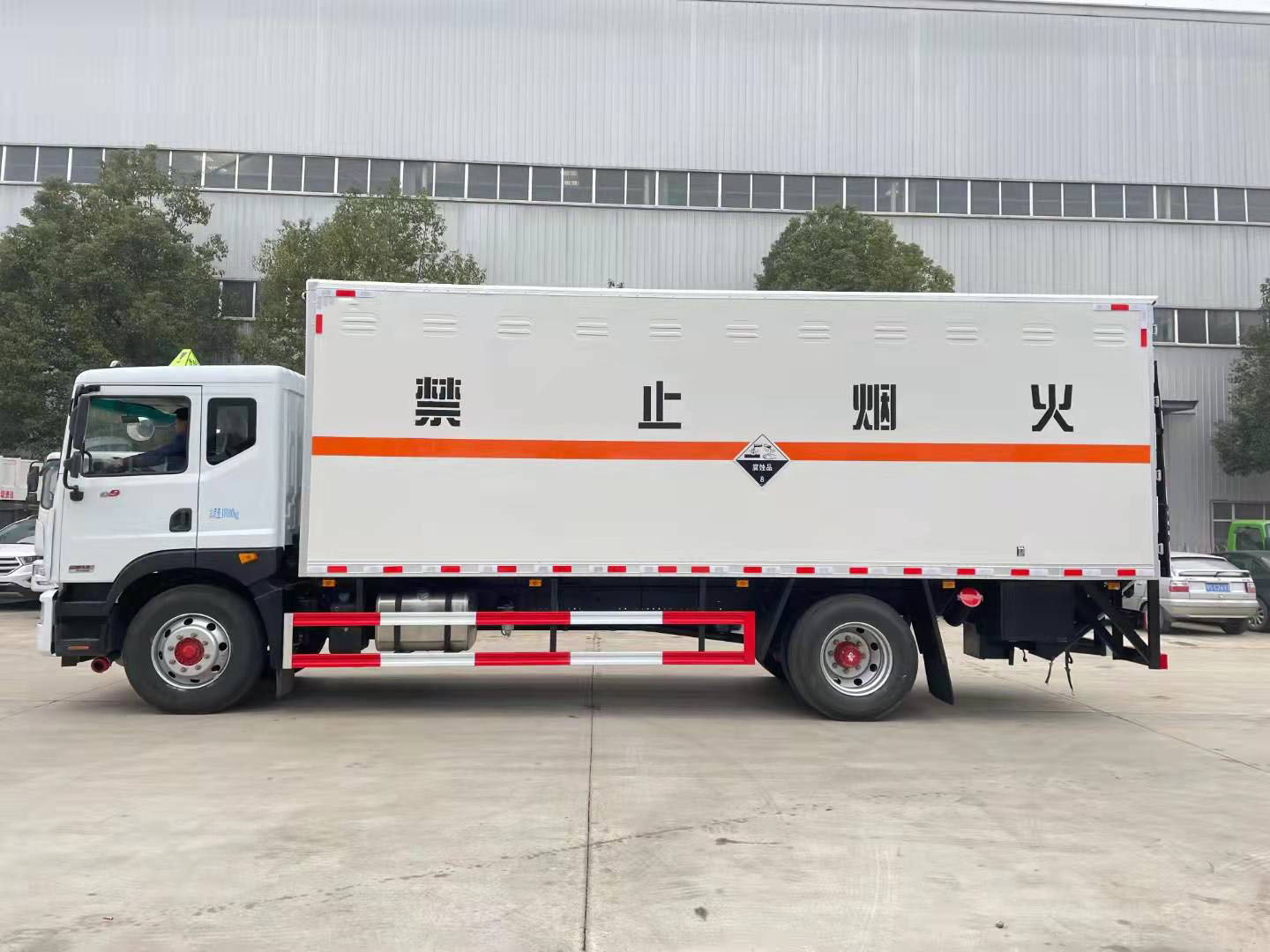 10噸腐蝕品廂式運輸車采用東風D9原廠危險品車底盤,康明斯220馬力發動機,帶ABS、原廠空調、排氣管前置、帶方向助力、限速裝置,帶安全帶未系提醒、剎車襯片預警提示、防爆胎裝置。