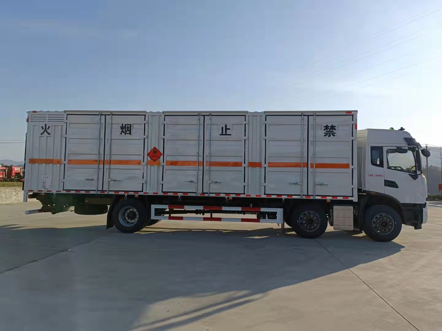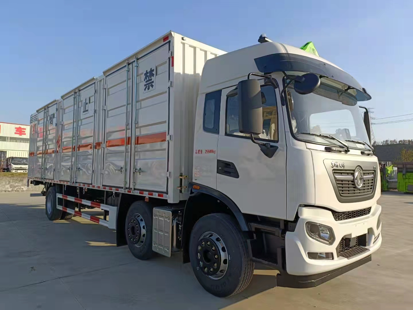 東風天錦KR三軸國六高頂雙臥危險品車采用的是東風天錦6*2小三軸危險品運輸車,東風DDi75E260-60發動機,法士特八檔變速箱,D560KR高頂雙臥駕駛室,10噸后橋,295/80R22.5 18PR真空胎,空調,中控門鎖,電動玻璃,行車記錄儀,雙預警,符合全新法規項。貨箱尺寸:9800*2450*2400mm。