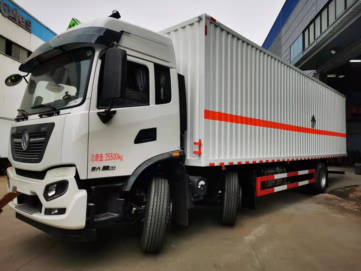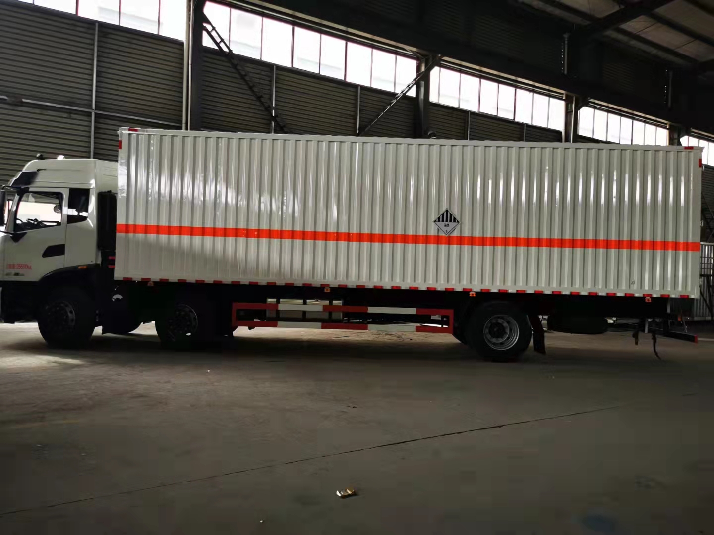 東風天錦三軸高頂雙臥9米6危險品車采用瓦楞板箱體,廂體四周鋁合金包邊及包角,車廂底板鋪設防靜電膠皮,。后部設置對開門,可選裝側門位置,廂體內部安裝氣體感應器及防盜報警器。車廂一周粘貼橙色放光帶,箱體粘貼 菱形告示牌,安全告示牌,危險品牌,箱體安裝示廓燈(前白后紅),拖地靜電帶。
