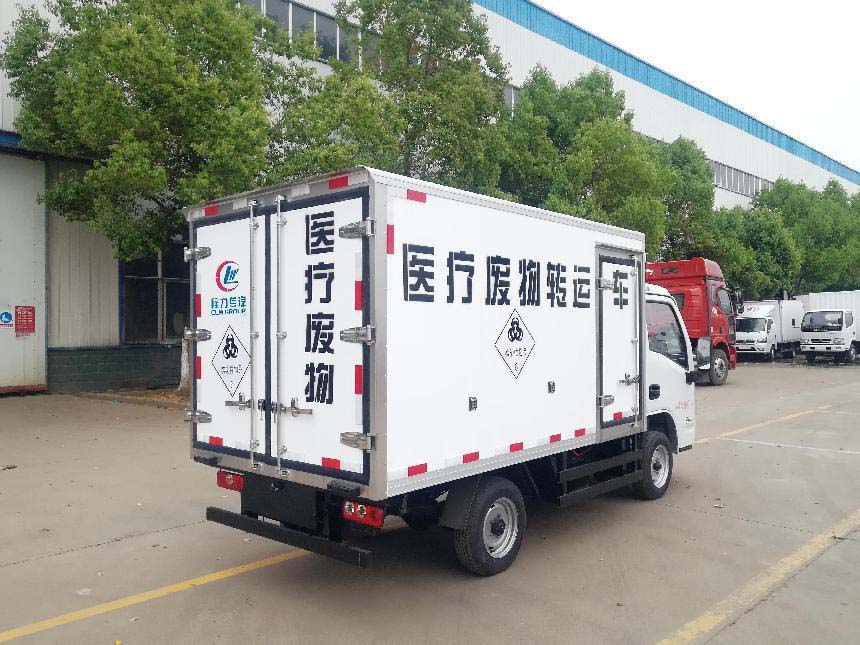 躍進國六后單輪醫療廢物轉運車廂體特點:(1)醫療廢物轉運車是根據醫療垃圾運輸的特點設計而成,廂體為全密閉型,確保廂體內盛裝的醫療垃圾與外界的隔斷,同時又方便貨物的裝卸。