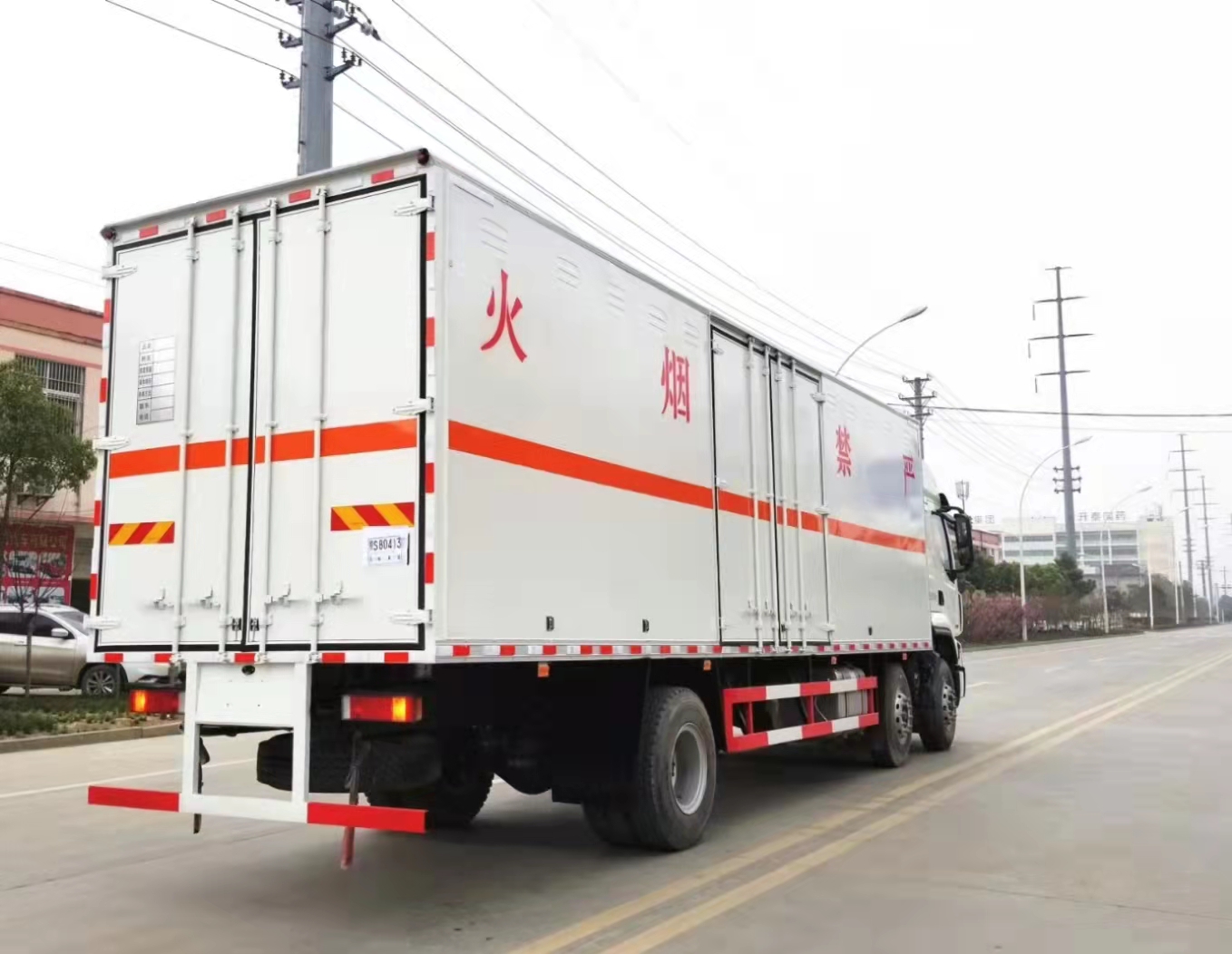 柳汽三軸9米6國六爆破器材運輸車整車尺寸:11900×2550×3960mm,廂體尺寸:9500×2400×2410mm。外板采用1mm厚冷軋板有一次性成型的百葉窗,內飾為導電性能良好的鋁板有透氣孔,內襯為矩形管骨架牢靠穩定,內部填充為透氣防潮阻燃的擠塑板,廂體外部上下鋁合金型材包邊,底板和車廂前下部鋪橡膠皮,后門雙開,右側選裝雙開門,內部有固定貨物的臥環,車輛外部有靜電帶、滅火器、防火罩,車廂內安裝煙霧報警器和門防盜報警器,嚴格按照國家危險品相關法規張貼危險品標識和反光標志等。