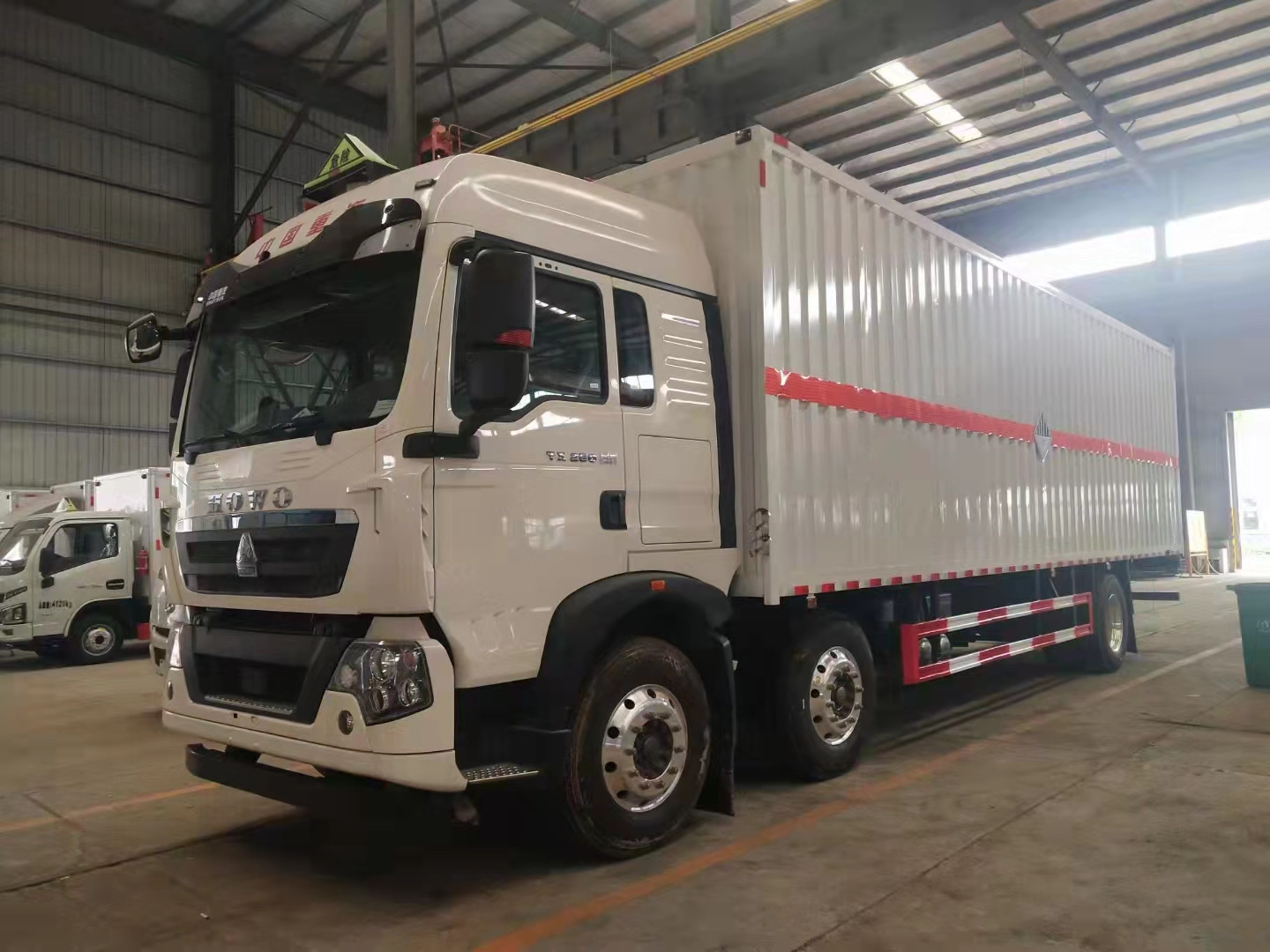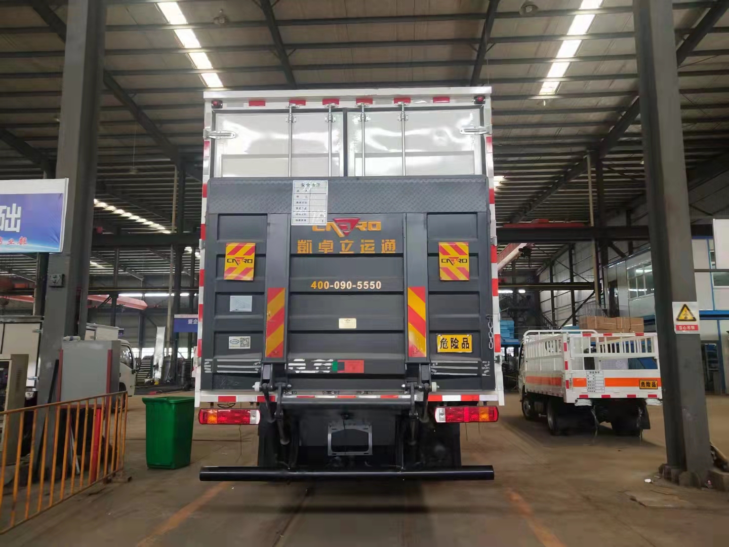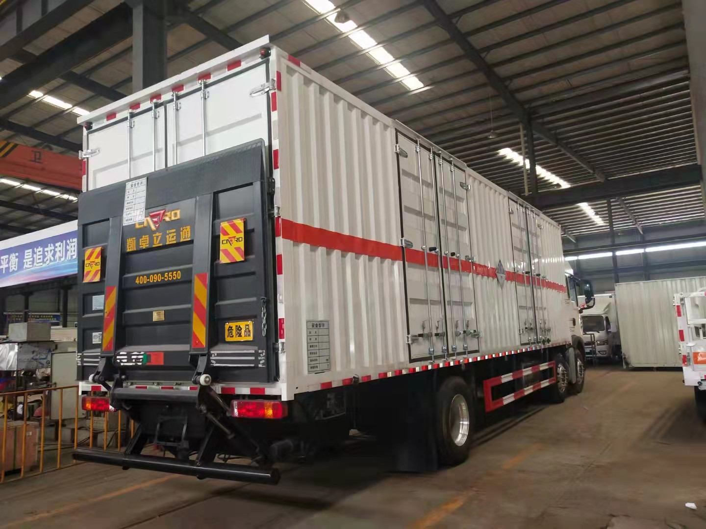 汕德卡國六9米6危險品車采用的是EBS電空制動系,F(xiàn)CWS/LDWS前撞/車道偏離預(yù)警,TPMS前軸單臺胎壓監(jiān)測。帶兩個滅火器、一個防火帽,靜電帶,隨車工具。罐體及杠貼反光條、反光帶、安全告示、貼 “易燃” 標(biāo)。介質(zhì):汽,柴油。整車具備燃油公告,我方提供車輛上戶所需的國六底盤證、整車合格證、罐檢報告、探傷檢測報告、海底閥證明。保證此款公告帶環(huán)保和燃油。外板采用冷軋鋼板一次性沖壓成型的百葉窗,內(nèi)飾為導(dǎo)電性能良好的鋁板有透氣孔,內(nèi)襯矩形管骨架牢靠穩(wěn)定,骨架內(nèi)部填充為透氣防潮阻燃的擠塑板。廂體外部四周鋁合金型材包邊,底板和車廂前下部鋪橡膠皮,后門雙開,右側(cè)選裝側(cè)開門,內(nèi)部安裝固定貨物的臥環(huán)或腰欄,安裝煙霧、防盜感應(yīng)器。車身附件靜電接地帶、滅火器、防火罩、危險品三角燈、橙色反光帶、CCC反射器、菱形標(biāo)志牌、危險品牌、安全告示齊全。
