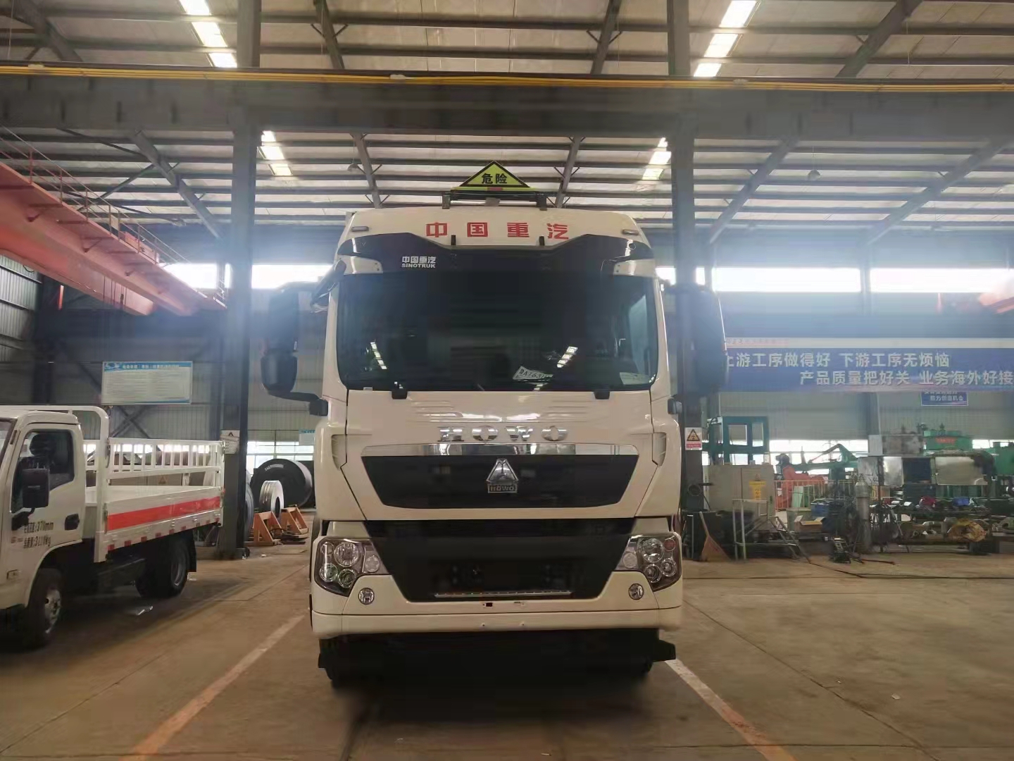 汕德卡國六9米6危險品車采用的是汕德卡 G5專用車,G5-F駕駛室 ;MC07H.35-60發(fā)動機(jī);HW13709XSTC2變速箱+HW70法蘭式取力器;VPD75D前軸(盤);MCY11BGS自調(diào)臂雙后橋(鼓);速比4.63;雙層車架(8+4/280);前少后空氣懸架(3/3/-/-);博世方向機(jī);前置排氣系統(tǒng);EBS+ESC;高位杠(全金屬);295/80R22.5;400L油箱;LDWS+FCWS;旋鈕式PTO;重汽智能通B版;電磁式電源開關(guān);轉(zhuǎn)向輪爆胎應(yīng)急裝置。