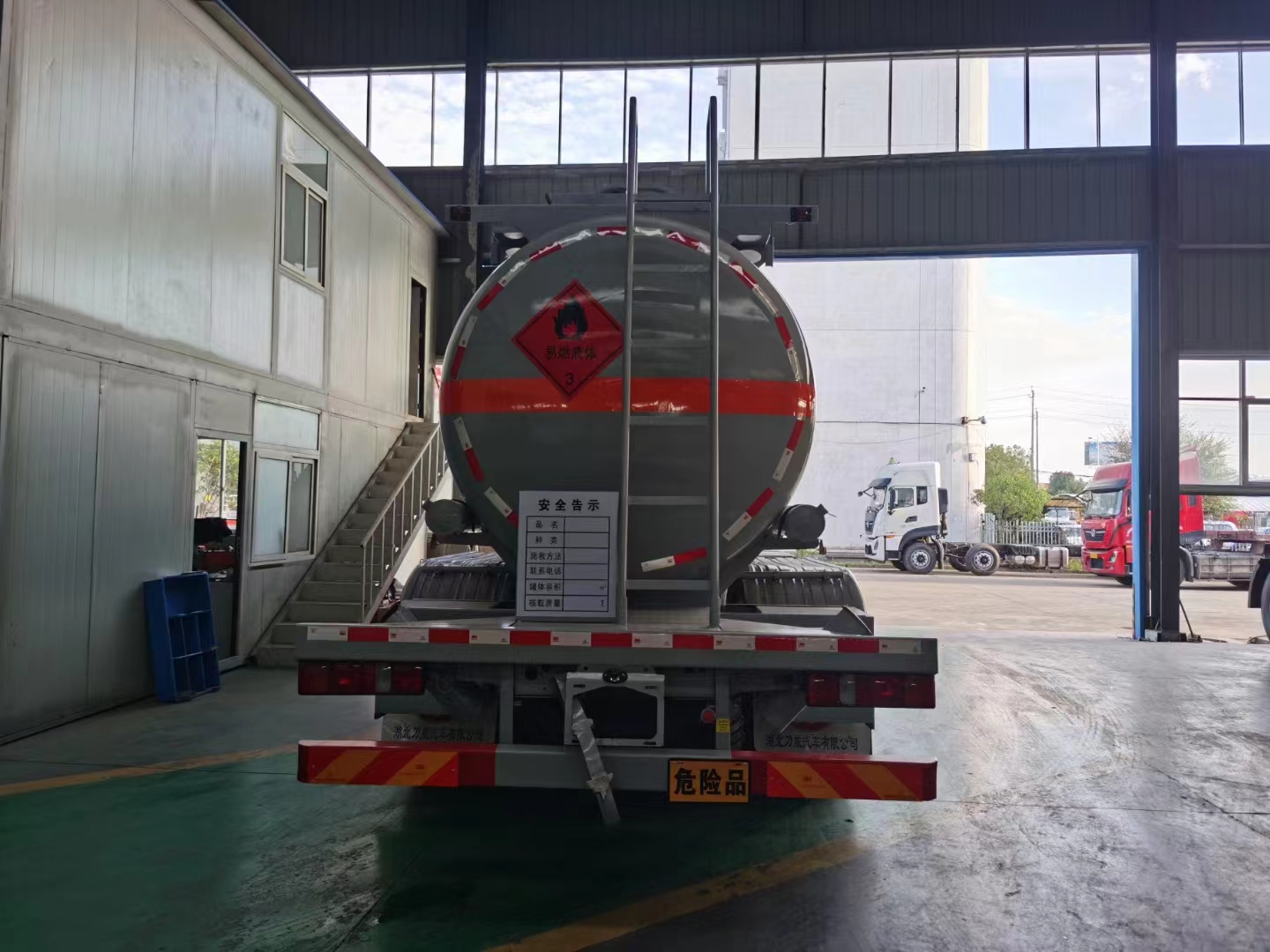 汕德卡后雙橋國六易燃液體罐式運(yùn)輸車外罐體材質(zhì)為Q235B型4.2mm厚板材,封頭4.5mm厚,罐體通倉,內(nèi)襯16mm聚乙烯,雙層鋼襯塑防浪板,兩個(gè)全塑罐口蓋,兩套不銹鋼安全閥,帶全塑接酸盤并用軟管引下,罐口周圍用方盒子式圍邊,圍板內(nèi)做重瀝青防腐,罐體頂部帶不銹鋼升降護(hù)欄,花紋板走道,罐體尾底部帶一個(gè)DN100不銹鋼襯氟海底閥(海底閥帶聲光報(bào)警裝置),罐體后尾部左右各一個(gè)DN80襯氟球閥為出料口帶全塑保護(hù)箱,大梁下出料,一個(gè)工具箱,尾部爬梯。兩根卸料管,兩個(gè)8KG滅火器,其余標(biāo)配。
