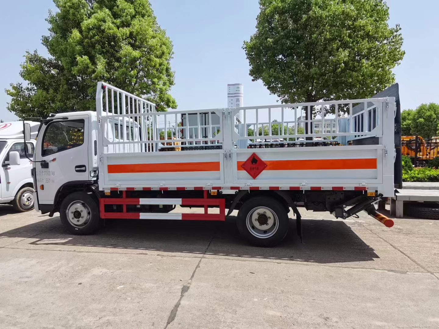 提到該款車型的重點在于該車額載大,同類型車中該車額載可達7.7噸,客戶拉重貨不用擔心超重的問題。東風福瑞卡國六4米5氣瓶車采用的是東風危險品專用底盤,云內150馬力發動機,廂體尺寸4500*2300*550mm。2030mm寬新款單排駕駛室,188雙層大梁,萬里揚6檔變速箱,245真空胎,前橋2.7噸,后橋5.5噸,帶原廠空調、中控鎖、電動門窗、防爆胎應急裝載,車廂采用的是冷板等鋼材焊接而成的高欄結構,高欄活動可拆卸,兩側欄板下翻轉,后部欄板下翻轉,欄板內兩側可選卡槽,前龍門架齊全,鋪設防靜電膠皮,箱體采用的是橙色反光帶、紅白相間反光板,安全告示、滅火器。