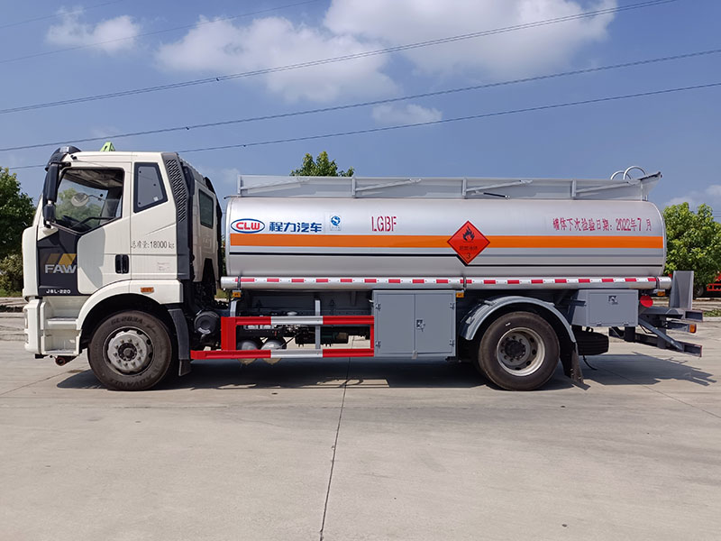 解放J6L國六10噸加油車采用的是標準的Q235碳鋼板制作,厚度5(mm),內置防浪板,前后水壓封頭;全套歐標包含:罐體頂部1個鋁合金歐標罐口帶鎖及內置呼吸閥,底部1個氣動緊急切斷閥;1套歐標下裝油裝置及油氣回收系統,1套防溢流系統;安裝海底閥智控系統和緊急切斷開關;罐體頂部上圍板,內置式上走道,兩側安裝活動護欄,尾部安裝爬梯一個;泵進泵出口及下裝油口安裝在車身一側閥門箱內,另一側安裝車載加油機帶15米自動回位卷盤,鐵擋泥板,鐵制側、后防護欄,兩根鐵制管道筒配3寸PVC透明輸油膠管2根;安全告示牌一個,安裝靜電拖地帶,靜電接盤,配備滅火器2支;罐體銀灰色油漆,中部粘貼橙色反光帶,粘貼“易燃液體”及紅白反光標識,LED示廓燈;出具罐體檢驗報告,合格證,一致性證書,產品質量證明書等。