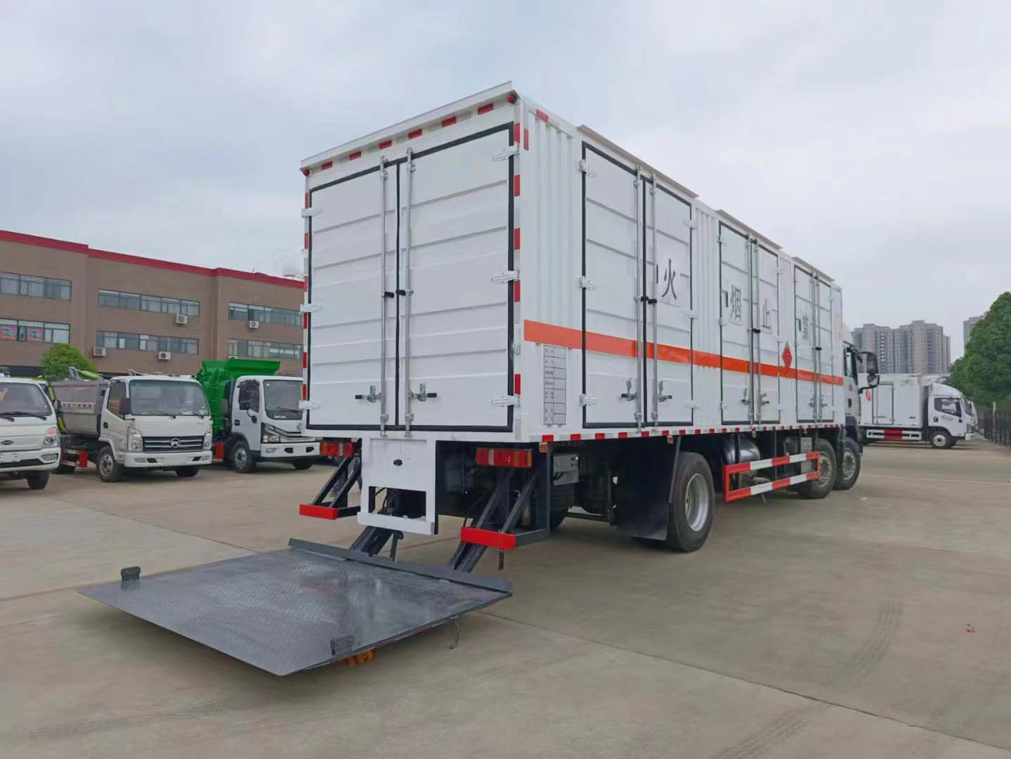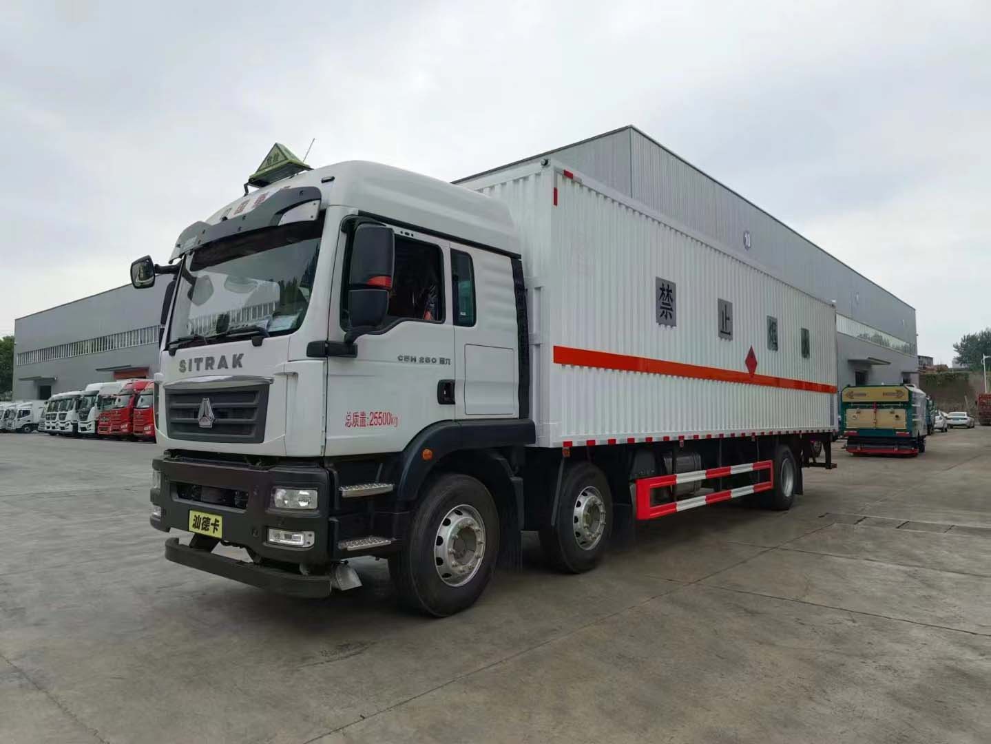 汕德卡G5暢行三軸國六雜項危險品車擁有高強度車身,帶前下視野及后視鏡全面優化。鋼鐵之軀,視野開闊。采用的是匠心之作,劍指高端。非凡實力,品質卓然。車身采用的是瓦楞板折彎而成,強勁動力,箱體為了裝貨方便采用的是帶三開側門箱體,尾部可選帶液壓尾板圖片,方便裝卸貨物。