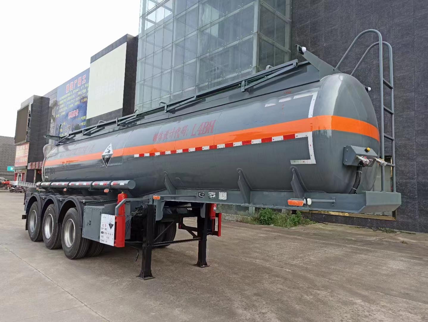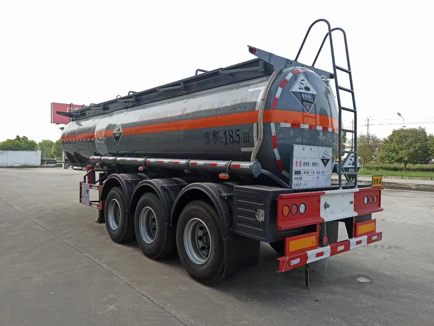 拉濃硫酸需要注意的罐體部分,硫酸密度非常高,所以要求的襯塑細(xì)節(jié)跟其他不一樣。該車罐體采用優(yōu)質(zhì)國標(biāo)Q235碳鋼材質(zhì)制作,筒體厚度封頭厚度按GB18564-1設(shè)計,罐體內(nèi)部襯聚乙烯16mm厚。罐頂單圍板,圍板內(nèi)做防腐處理,兩側(cè)鐵質(zhì)活動護(hù)欄,罐頂兩個全塑進(jìn)料口帶接酸盤(采用標(biāo)配子口直徑為250mm),接酸盤和罐頂做落水管引至后封頭落水。罐體單倉,罐體內(nèi)防蕩隔板按技術(shù)設(shè)計。罐體底部一個DN100氣動不銹鋼襯四氟海底閥總控帶緊急切斷開關(guān)后保險杠控制(加裝5公里報警裝置),通過三通鋼襯塑管道,后尾部左右各一個DN80 鋼襯塑球閥帶DN80 PP出口,出口帶全塑保護(hù)箱。罐體兩側(cè)為PVC炮筒管,2根耐酸卸料軟管,2只8KG滅火器,罐體活動爬梯按公告圖片制作,三塊安全告示牌,按公告圖片張貼3M反光條、反光帶及腐蝕品標(biāo)識。罐體顏色:深灰色,整車外觀及尺寸嚴(yán)格按照公告圖片制作。