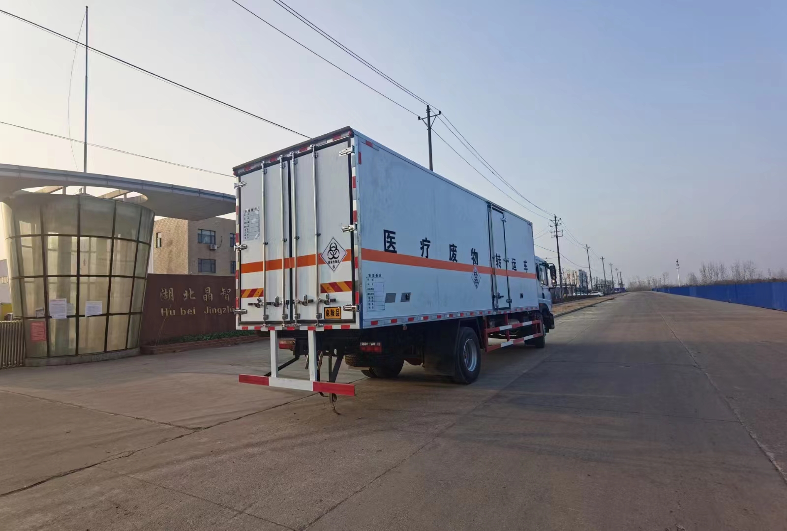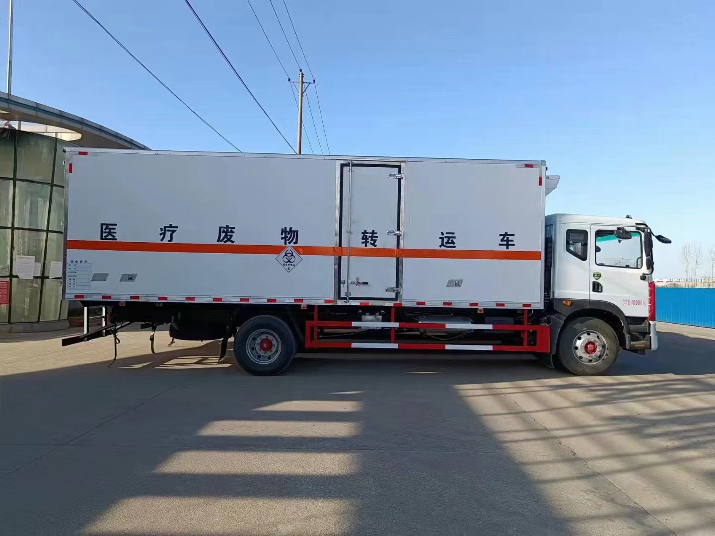東風D9國六6米8醫療廢物轉運車采用的是東風D9國六危險品車專用底盤,康明斯220馬力發動機,9噸后橋,帶中控鎖、電動門窗、原廠空調,方正的駕駛室,采用的是專用箱體,內外玻璃鋼,中間夾防阻燃材料,箱體內部帶不銹鋼內飾,頂部帶消毒設備及紫外線消毒燈。箱體內部可帶卡槽,車廂底部帶廢液收集箱。