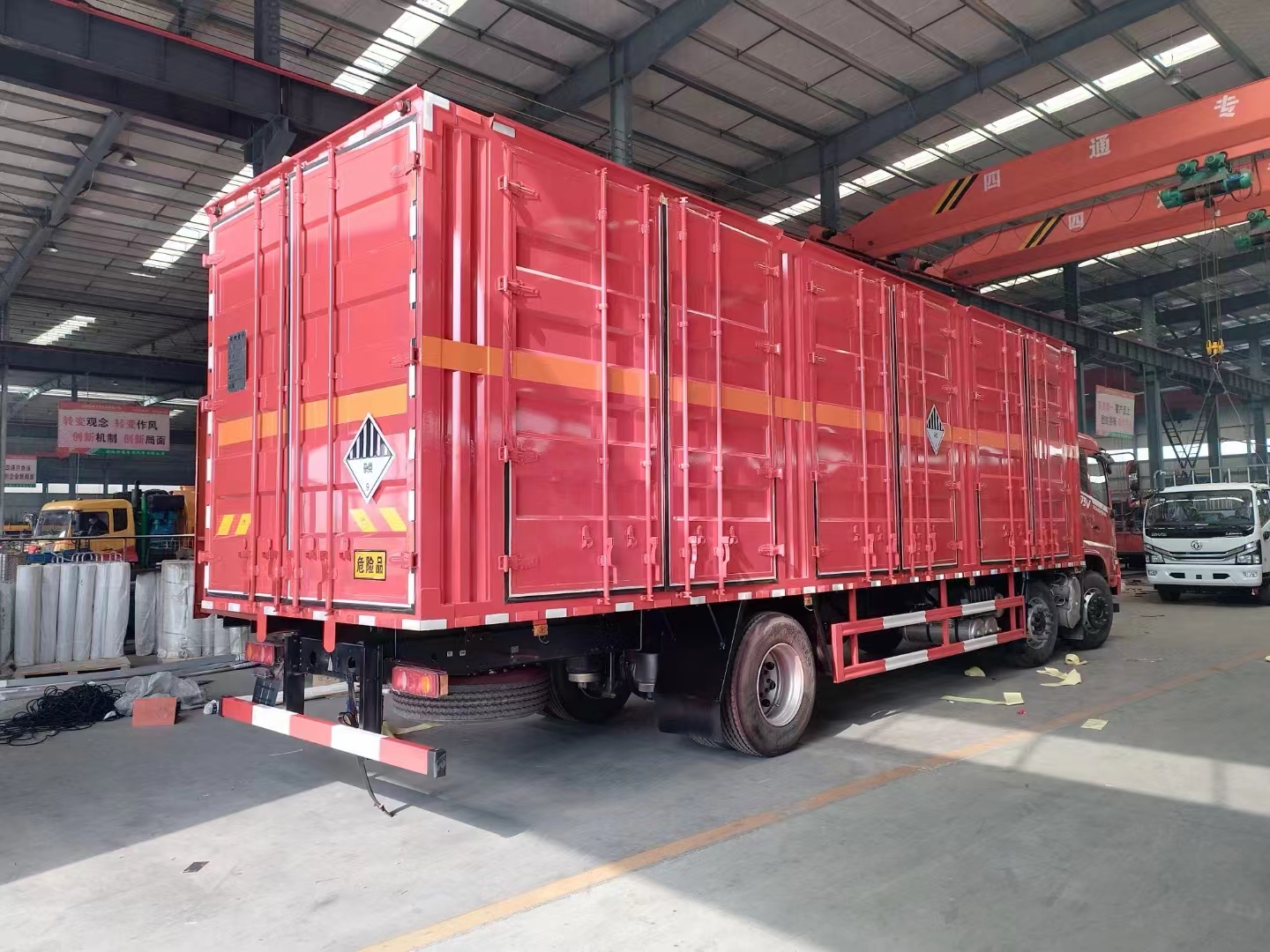 東風D3V國六9米6雜項危險品車采用的是專用危化品底盤,玉柴245馬力發動機,帶中控鎖、電動門窗、廂體外板采用瓦楞板箱體,有靜電帶、滅火器、防火罩。整車國標反光標示及警告標志。箱體右側帶兩個雙開側門。帶靜電接地帶、危險品三角燈、防火罩。帶整車合格證、發票、隨車工具、服務手冊、保修手冊。貨箱尺寸:9600*2450*2400mm,額載18噸,帶三個對開門,尾部可加裝液壓尾板。