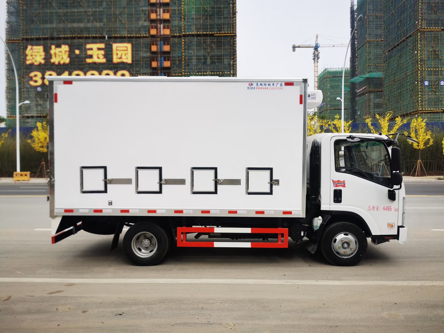 五十鈴KV100 國六藍牌雞苗運輸車廂體采用內外玻璃鋼板,中間8CM保溫板,鋁花紋底板,廂體前板2個百葉窗,尾門各加裝4個電子扇(帶滑門),廂體兩側下方各裝4個百葉窗(帶小門可開啟),廂體頂部安裝2個天窗,天窗兩邊各加裝4個電子扇,底板通風道,廂體兩側安裝貨架,加裝加熱器和制冷機組。