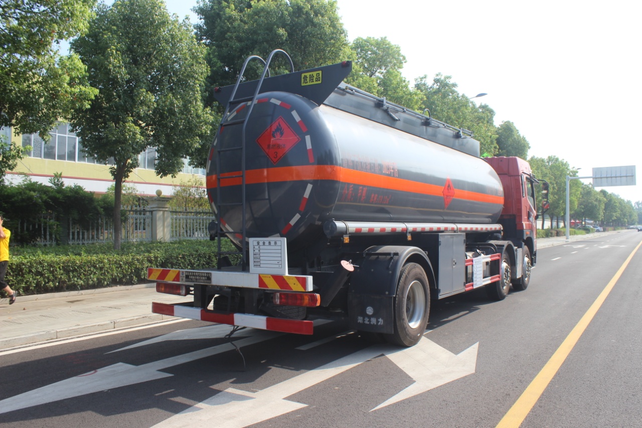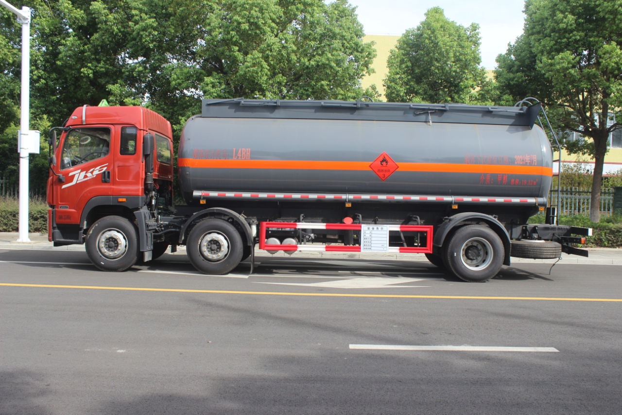 解放JK6國六三軸易燃液體罐式運輸車罐體介質(zhì):甲醇, 嚴(yán)格按公告尺寸及外型制作,罐體采用304不銹鋼,一個不銹鋼普通罐口,帶安全閥和爆破片,不銹鋼泵,泵進(jìn)泵出口在側(cè)中部,管道球閥出口均為不銹鋼,一個不銹鋼海底閥,與液體接觸部位為不銹鋼,海底閥5公里駕駛室語音提醒,鐵制折疊護(hù)欄,鐵制炮筒管,后爬梯,一個工具箱,兩具鐵制滅火器桶,靜電拖帶,兩根與管道箱同長的輸液管及快接頭,兩具滅火器,罐體顏色銀灰色,貼反光帶,反光條,罐體左、右、后貼3個“易燃液體標(biāo)識”。