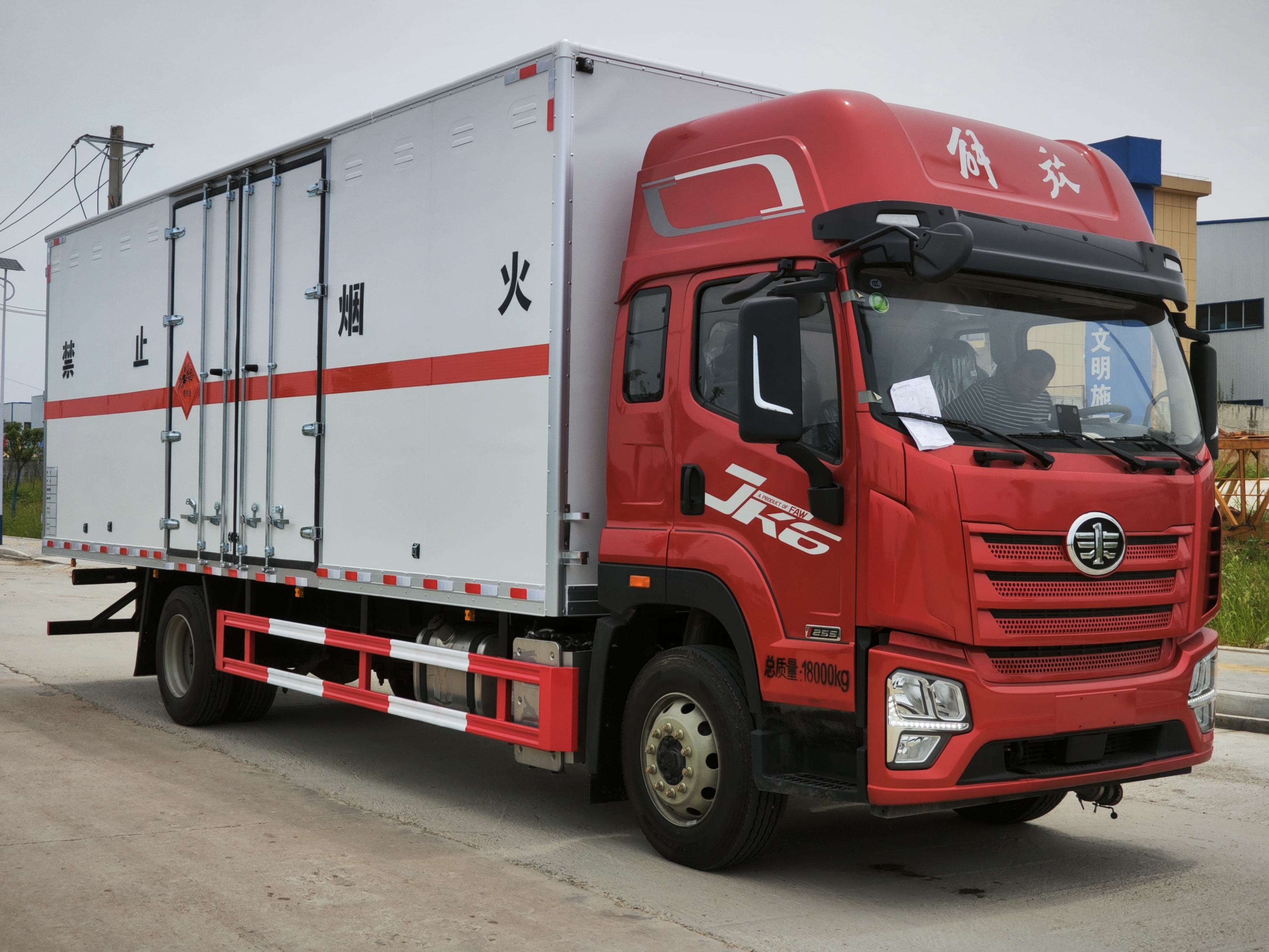 解放JK6國六7米8爆破器材運輸車采用的是專用危化品配送車,錫柴250馬力,高頂雙臥駕駛室,法士特8擋變速箱,匹配的是電動玻璃升降、電動后視鏡、側圍網兜、后圍窗簾導軌、全景窗簾導軌、頭頂放物盒、駕駛員座椅為空氣減振座椅、中間座椅、單DIN北斗兼容車載系統、電源總開關控制開關,ф395離合器,變速箱CA8TAX090F變速器,240PS,車橋ф378沖焊橋(進口ABS、1878輪距),275/80R22.5型18層級無內胎,新F4N-1900前軸,速比:4.875,其他:237×75×6.5,自動空調、前下防護裝置、VOSS管路及接頭、300L鋁油箱、電子手油門、一體式金屬寬體保險杠、電動液壓舉升、限速79km/h、排氣火花熄滅器、整車配備靜電拖地帶1根、駕駛室帶2kg干粉滅火器1個、排氣尾管及消聲器前置、前盤后楔式制動器、懸架3/-(4氣囊、電控ECAS)、安全帶佩戴提醒、制動器襯片更換報警、爆胎應急安全裝置、U型后處理、EBS(電控制動系統)、ESC(電子穩定性控制)、單胎帶TPMS(胎壓監測)、鋁貯氣筒、LDW(車道偏離報警)、FCW(前碰預警)、車身左側帶“精致版”字樣、U型后處理、T-box1.5、排氣節流閥、AEBS(自動緊急制動),后懸架升級加強。