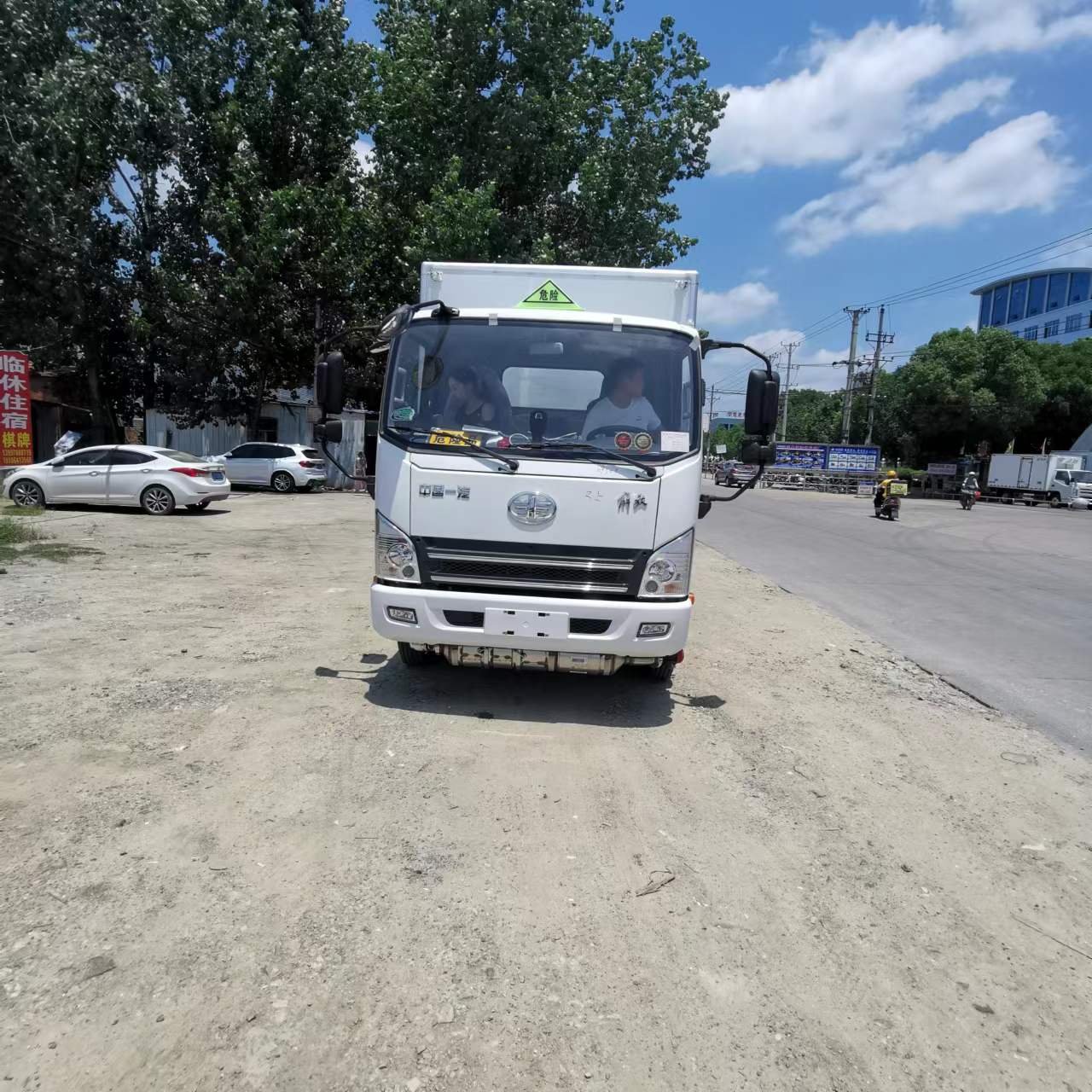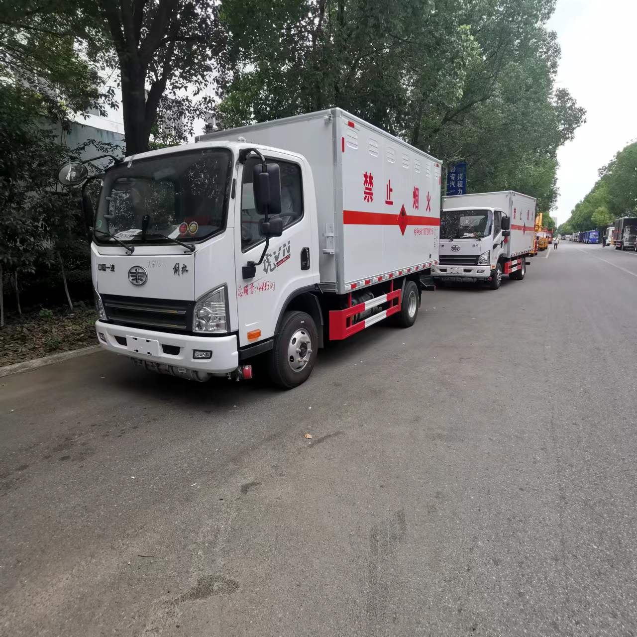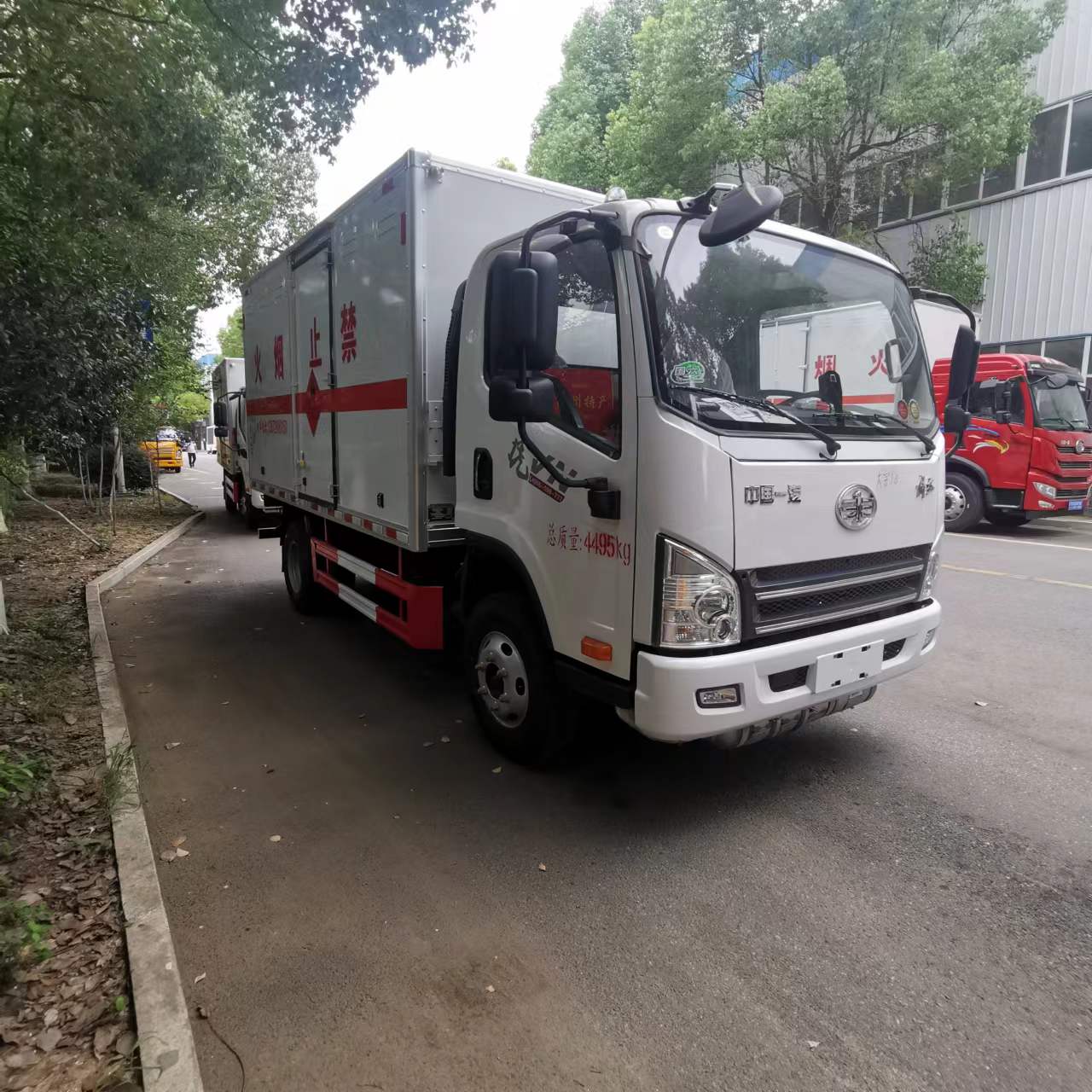解放錫柴140馬力危爆車廂體為雙層金屬骨架結構,外板采用冷軋鋼板,中間填充阻燃泡沫,內飾為鋁板。底板為平板上鋪防靜電膠皮。廂內兩側加裝固定貨物臥環,門框帶防盜報警器,頂部帶煙霧報警器,廂體右側選裝側門,隨車配 2 個滅火器,危險標志牌,防火帽,危險品三角頂燈。