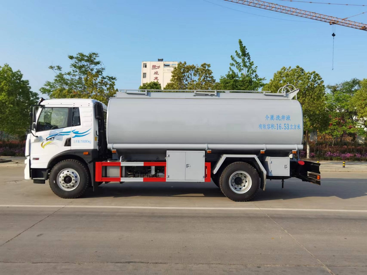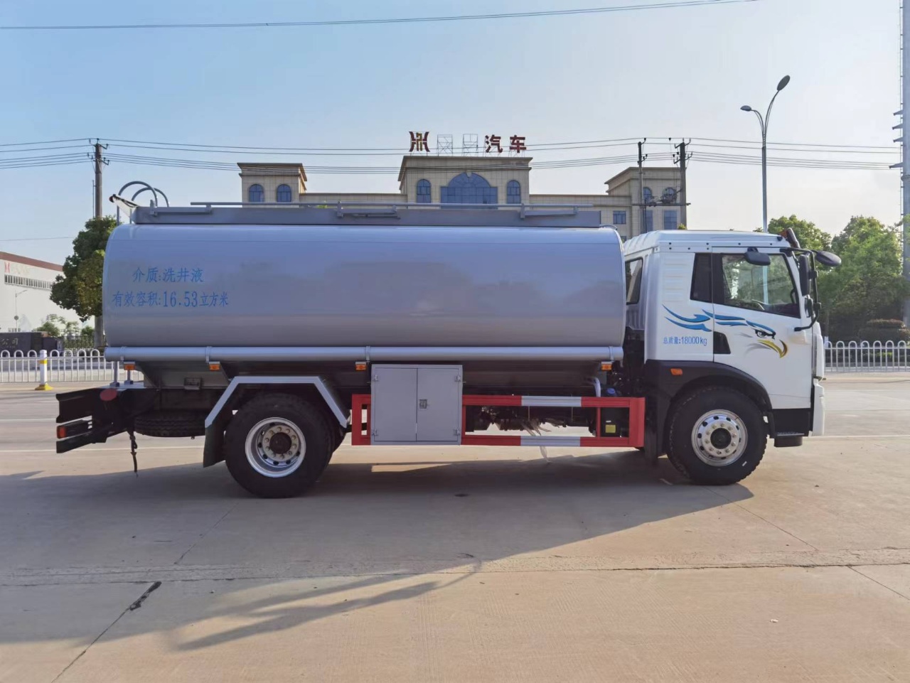解放龍V國六普通供液車罐體采用武鋼Q235B筒體4.0mm厚優(yōu)質(zhì)碳鋼制作,封頭4.5mm,罐體通倉。罐體內(nèi)襯聚乙烯塑,雙層鋼襯塑隔板,一個全塑罐蓋帶全塑接酸盤并用軟管引下,罐體頂部帶上圍板,圍板內(nèi)做防腐處理,罐體頂部兩側(cè)帶活動護(hù)欄。罐體尾底部裝一個DN1OO氣動襯氟蝶閥為總閥,后尾部大梁下左右各一個DN80全塑球閥帶全塑出口盤(用4寸管道襯塑),帶全塑保護(hù)箱,尾部爬梯,兩根罐體等長卸料管,兩個滅火器,其余廠家標(biāo)配。
