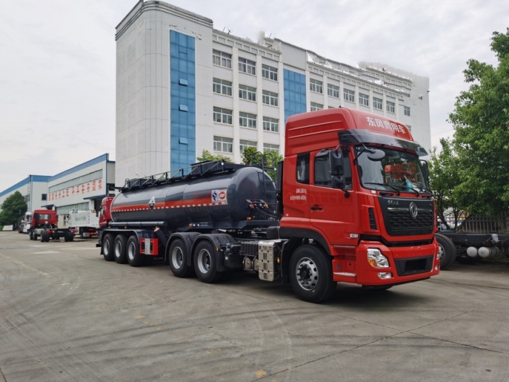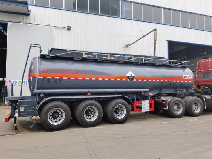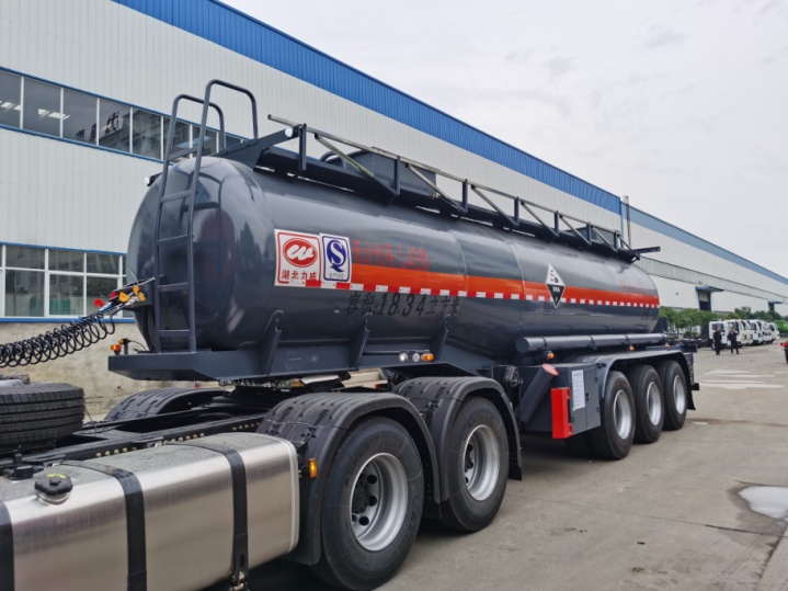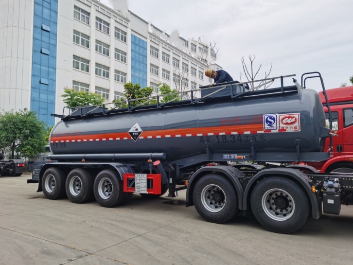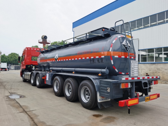 拉硫酸專(zhuān)用腐蝕品半掛車(chē)嚴(yán)格按照公告圖片及公告尺寸制作,整車(chē)型號(hào)為:HLW9401GFWA,罐體總?cè)萘?18.34立方米。罐體材料為Q235B型碳鋼板材,筒體厚5.5mm,通倉(cāng),兩個(gè)普通碳鋼罐口帶接酸盤(pán),罐口周?chē)鷰Х叫伪Wo(hù)箱(內(nèi)做防腐處理),一套不銹鋼安全閥,罐體尾底部帶一個(gè)DN100不銹鋼海底閥(海底閥帶聲光報(bào)警裝置),罐體尾部左右各一個(gè)304不銹鋼自流口,用DN80型304不銹鋼球閥控制,帶全塑保護(hù)箱,大梁下出料。全車(chē)4寸不銹鋼管道,罐體頂部左、右側(cè)帶活動(dòng)舉升護(hù)欄,走道,碳鋼后爬梯,兩個(gè)滅火器,兩根卸料管(帶不銹鋼陰陽(yáng)端),其余按廠家標(biāo)配。