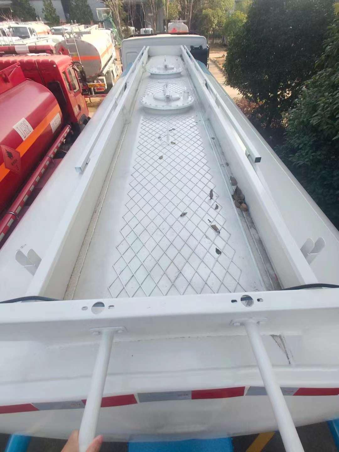 出口重汽6*4左舵油罐車現貨一臺!24年2月份完工,有急需現貨可以了解下。這款車采用的是重汽豪沃T5G后雙橋平頂駕駛室,搭載的是中國重汽 MC系列德國曼技術280馬力的發動機,匹配的是九擋變速箱,Ø430人膜片彈簧離合器;采用的是4600+1350mm的軸距,7.5噸的前橋,11噸的雙后橋,曼車架,295/80R22.5 18PR的鋼絲胎等配置。這款車的外形尺寸是長9.83米,寬2.5米,高3.35米,總質量是25噸,整備質量是12.87噸,額定載質量是12噸,罐體外形尺寸是長6.9米,寬2.3米,高1.6米,罐體有效容積為17立方米。罐體頂部安裝的有罐口及折疊扶手,不用時可以收起來;在罐體的尾部制作的有爬梯,方便工作人員上下。頂部兩端安裝的有警示燈,用來提醒行車安全。在罐體的左右兩側安裝的有兩個炮筒,用來安放吸液管,以免行車中掉落。