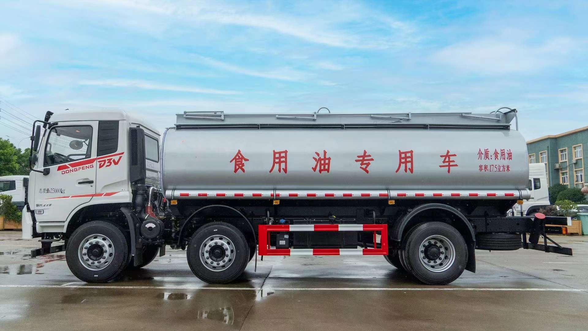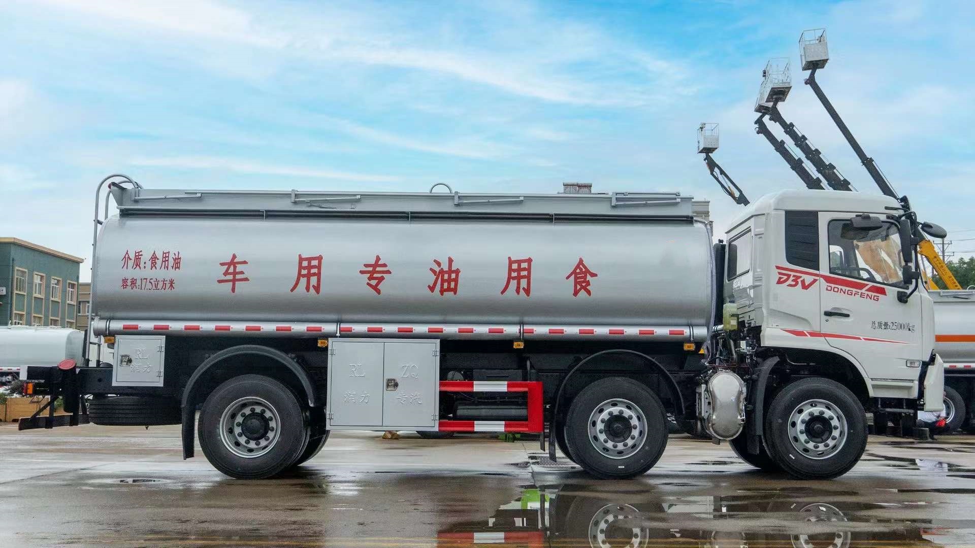 東風(fēng)20立方國(guó)六食用油運(yùn)輸車整車外形尺寸mm:9350×2550×3200,罐休尺寸mm: 6300×2450×1520,總質(zhì)量kg:25000,額定載質(zhì)量kg:15005,整備質(zhì)量kg:9800,公告容積:19.5立方,介質(zhì):食用油罐體材質(zhì):304不銹鋼(食品級(jí)),選用的是東風(fēng)D3V平頂白色駕駛室,玉柴270馬力發(fā)動(dòng)機(jī),法士特九檔變速箱,軸距1995+3600,4.5T前橋,10T后橋,295/80R22.518PR,帶空調(diào)。