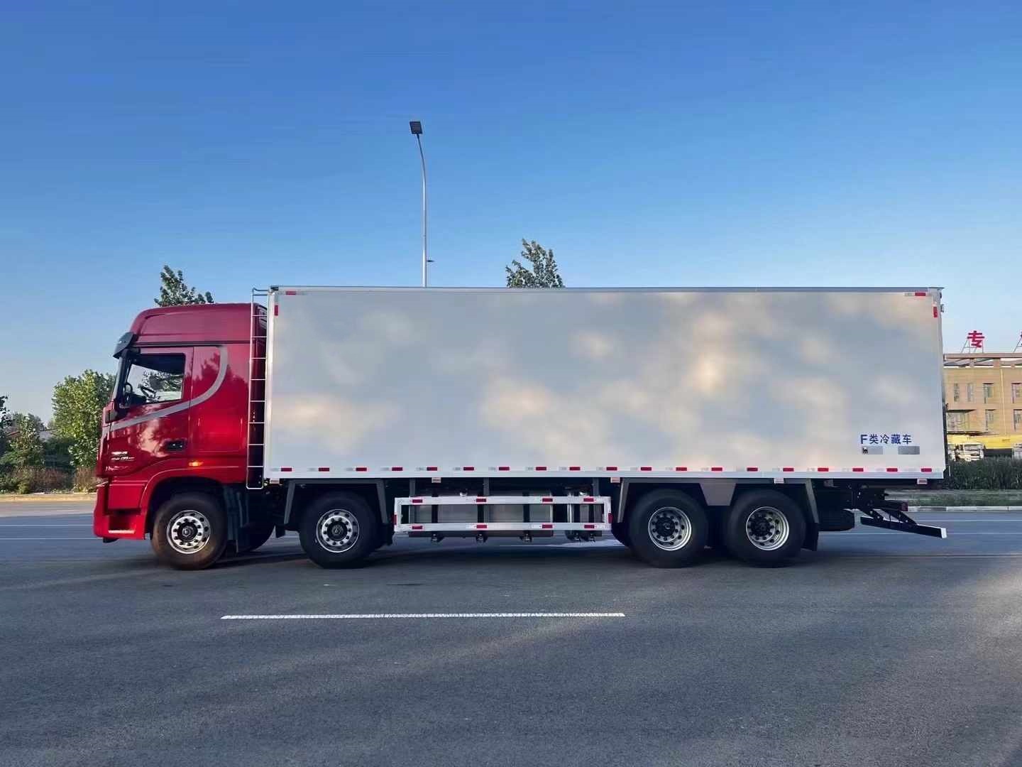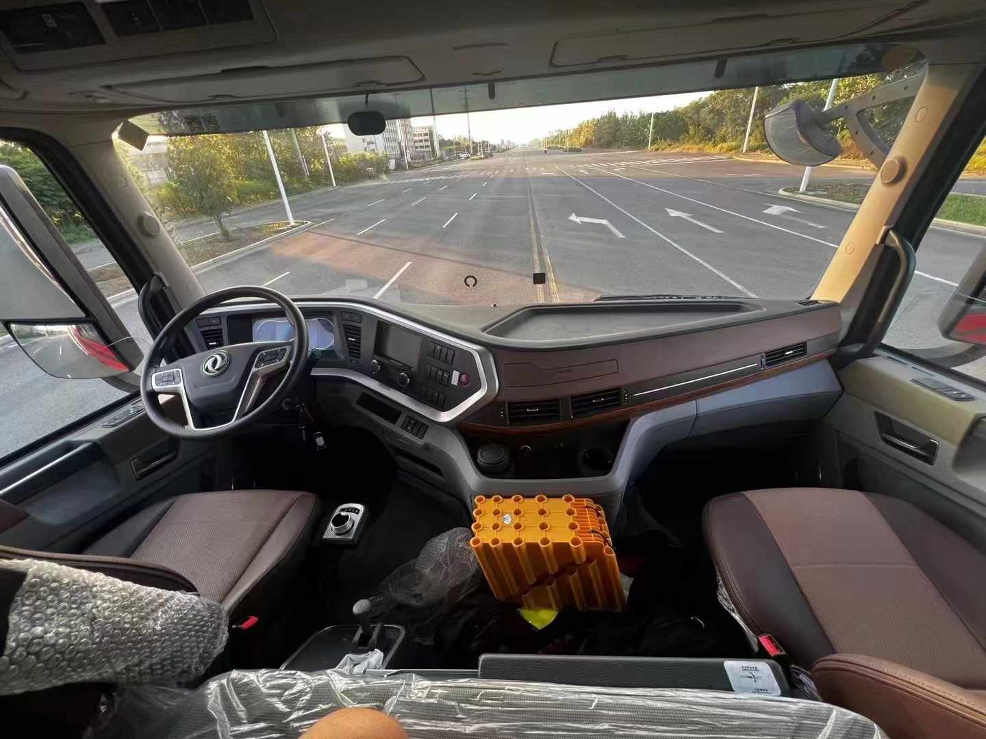 東風天龍KX旗艦版國六冷藏車整車型號:DFH5320XLCCX,整車尺寸:12000×2600×3990(mm),箱體尺寸:9400×2450×2500(mm),龍擎490馬力(DDi11E490-60),采用的是東風天龍旗艦760駕駛室、DA1223DD自動擋變速箱、12寸液晶顯示屏帶四方位倒車影像,前橋5T后橋10T、速比:2.87、板簧:3/3/-、車架:300*80*8、800L+200L鋁油箱、12R22.5 18PR輪胎、全浮式駕駛室懸。ㄋ狞c氣囊橋懸浮)、液壓電動駕駛室翻轉、全車免維護輪端、2人座椅、300KW逆變器、180Ah蓄電池,軸距:2050+4600+1350mm。時尚的外形,給人霸氣的外觀之感。