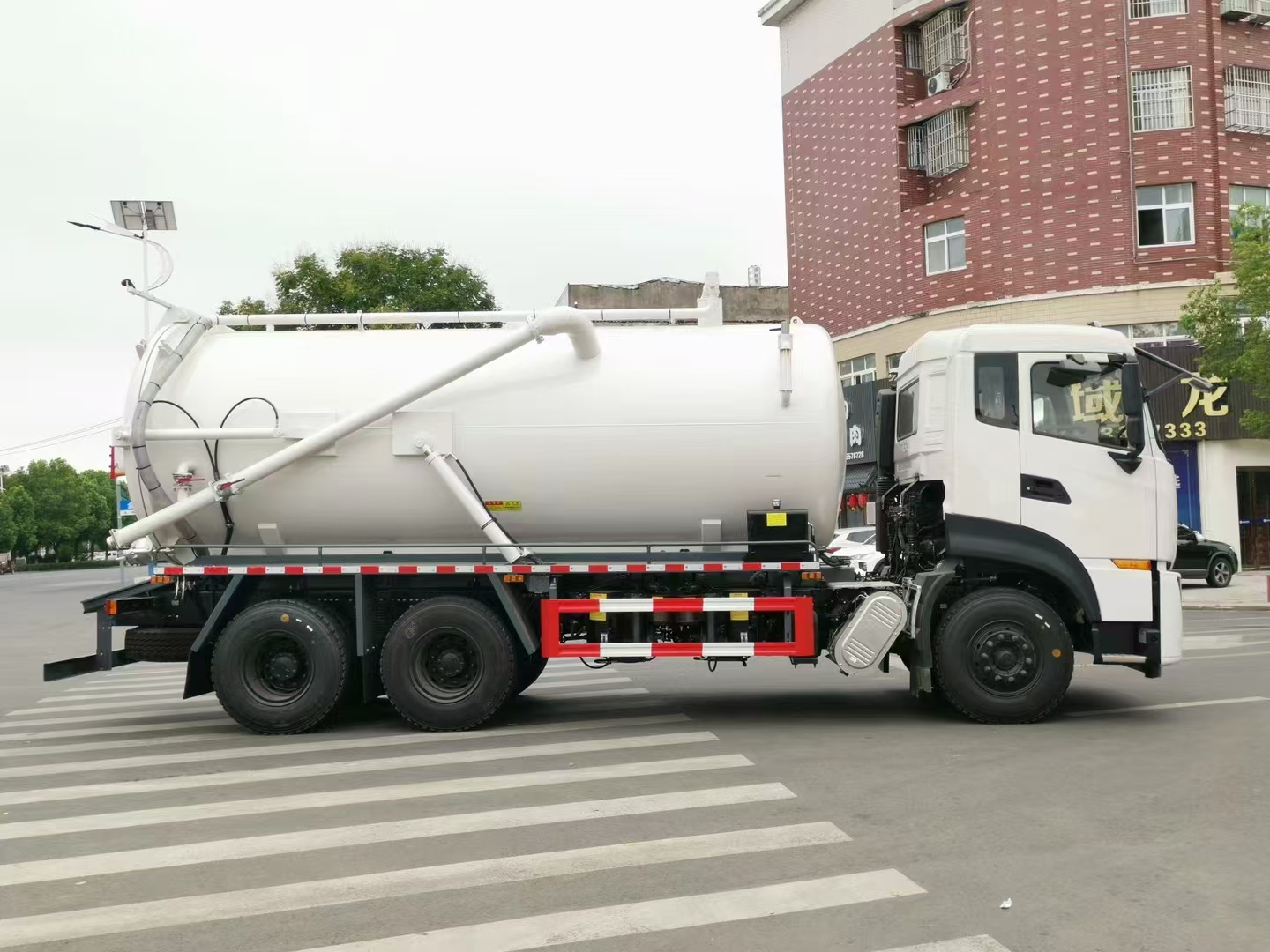 東風天龍后雙橋國六18立方吸污車采用的是白色天龍KL排半平頂駕駛室,6×4驅動,軸距4350+1350mm,四點懸浮,司機減震座椅,原廠空調,電動玻璃,中控鎖,遙控鑰匙,行駛記錄儀,龍擎340馬力發動機,法士特9檔變速箱,5.5T前橋,10T后橋,300雙層車架,11.00R20鋼絲胎,自動調整臂,斷氣剎,ABS。