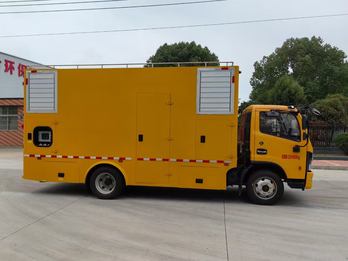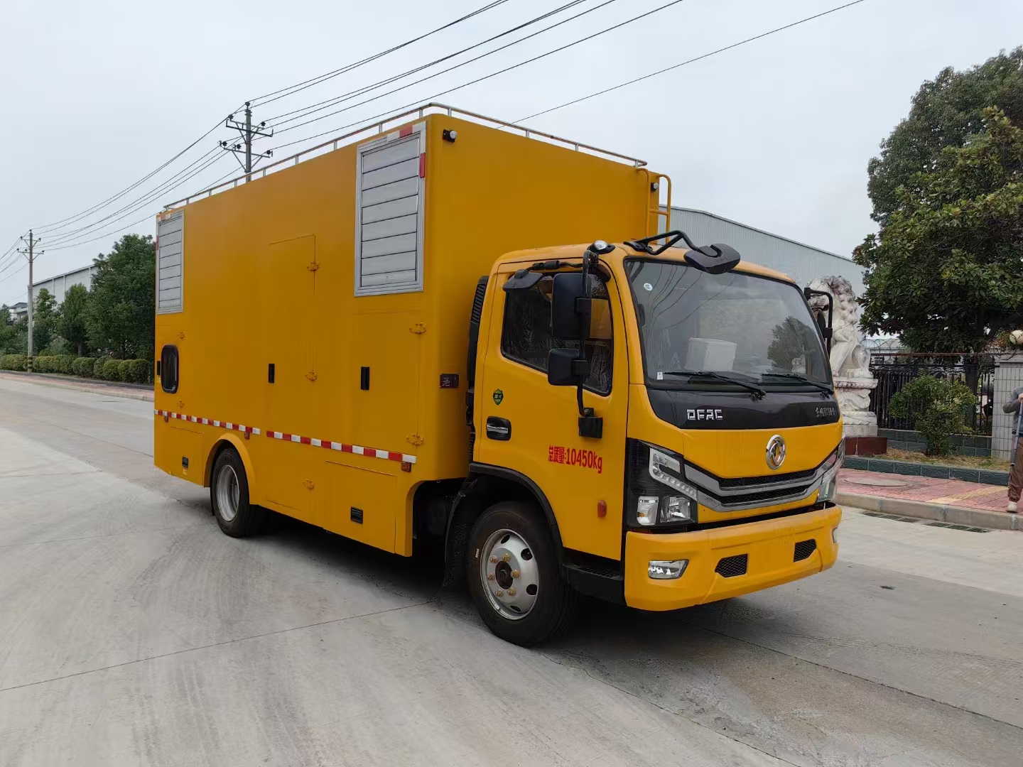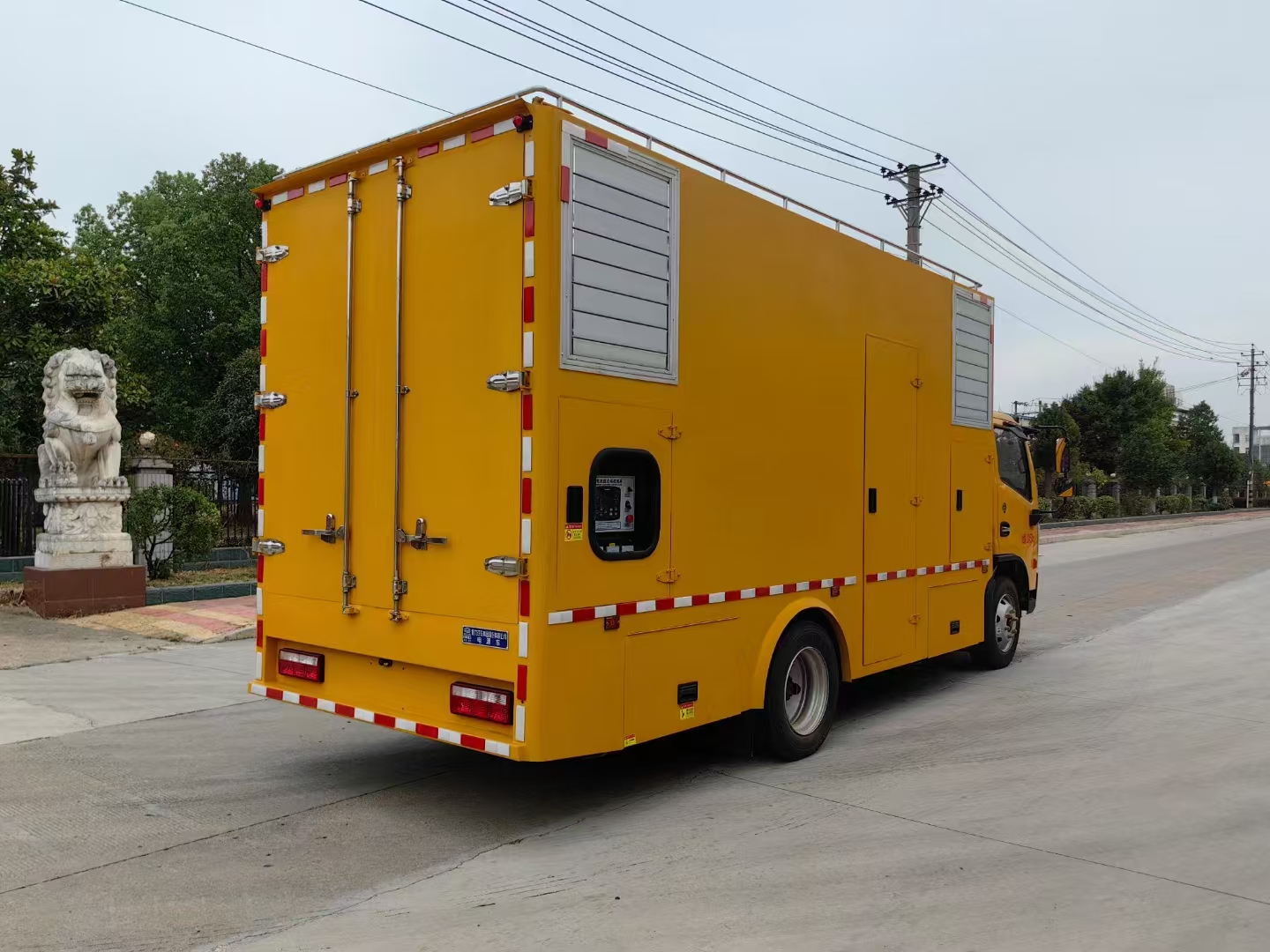 東風多利卡D7國六應急電源車整車型號:CL5100XDY6ACC,軸距3800mm,底盤型號:EQ1125SJ8CDC ,匹配有原廠空調(diào),方向助力,中控鎖,電動窗,玉柴 165 馬力,6檔變速箱。廂體外部鋼材為優(yōu)質(zhì)冷軋鋼板,內(nèi)襯優(yōu)質(zhì)冷軋鋼板折彎骨架,工藝先進,強度牢固。廂體為全密封結構,具備運輸、防雨、防腐、防火、防銹要求。車廂尾部為對開門。發(fā)電機組進排風消聲處理,消聲器做降噪處理。發(fā)電機組采用無刷發(fā)電機組,機組功率≥200KW,能滿足全負荷長時間連續(xù)安全運行,額定頻率 50HZ,額電壓 220/400V。調(diào)速方式:電子調(diào)速、啟動電瓶,電瓶總閘。發(fā)電機組的底座油箱容積能保證發(fā)電機組全負荷運行 8 小時所用,安裝位置合理方便維護人員日常加油。控制系統(tǒng)可現(xiàn)實水溫、油壓、轉(zhuǎn)速、頻率,各項電壓、電流、功率等均可實現(xiàn)一鍵智能化。車輛安裝四只液壓支撐腿,可在駐車狀態(tài)均分車輛靜壓,保護車輪及彈簧鋼板。選用進口優(yōu)質(zhì)多路閥組,液壓支撐缸采用進口密封件,單支腿靜載荷5噸,加裝雙向液壓鎖。