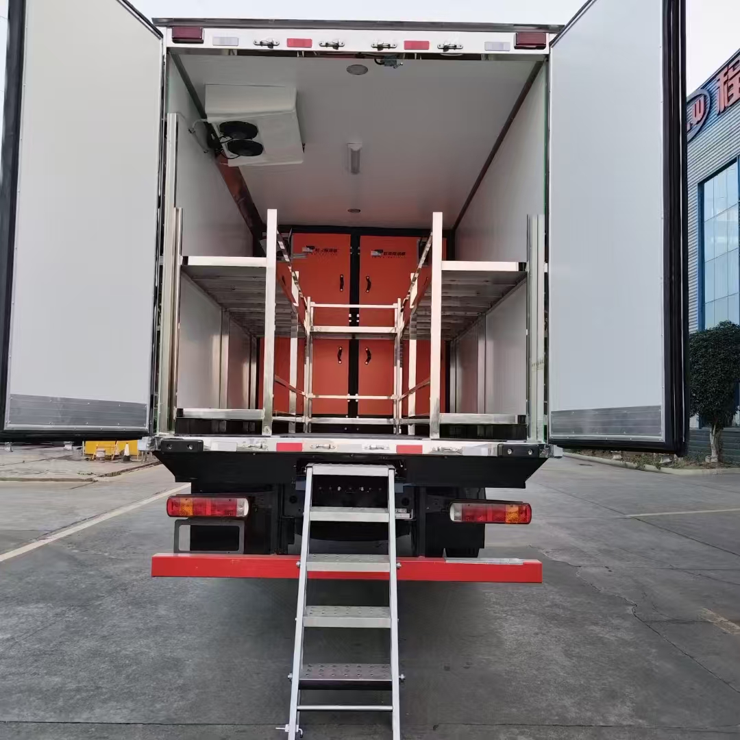 重汽豪沃國六消防應急冷藏車可提高工作效率,設計到達車輛頂部,使用不銹鋼材質,水、電、油路控制及安全防護系統。重汽豪沃國六消防應急冷藏車箱體內部裝有貨箱,里面裝有保溫隔板。可運輸海鮮魚蝦類水產、日常生活蔬菜水果類、豬牛羊肉等肉類食品、鮮奶冷飲等食品運輸。該車設備可加裝肉鉤直軌、屠宰場對接式導軌、備電系統、雙溫隔溫帶電子扇。