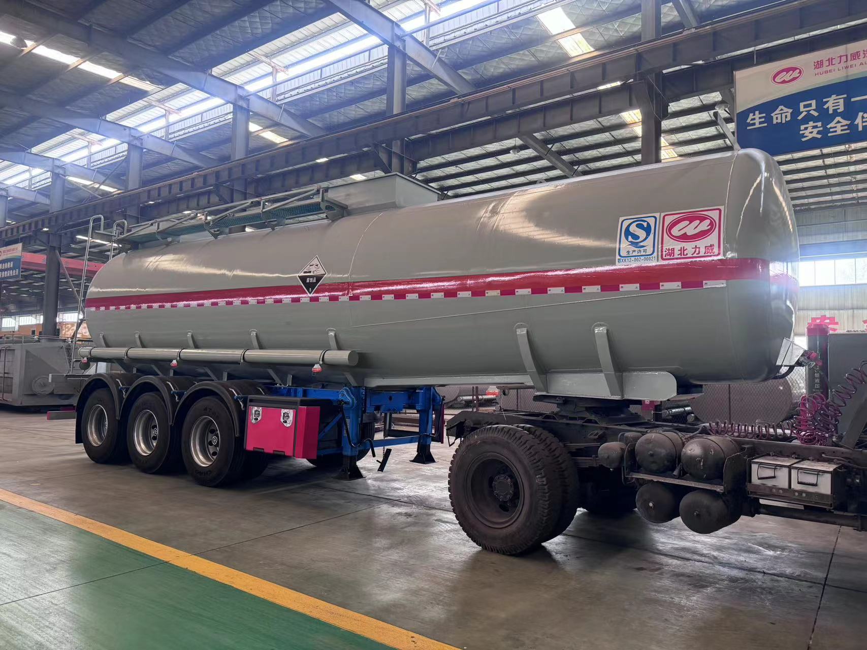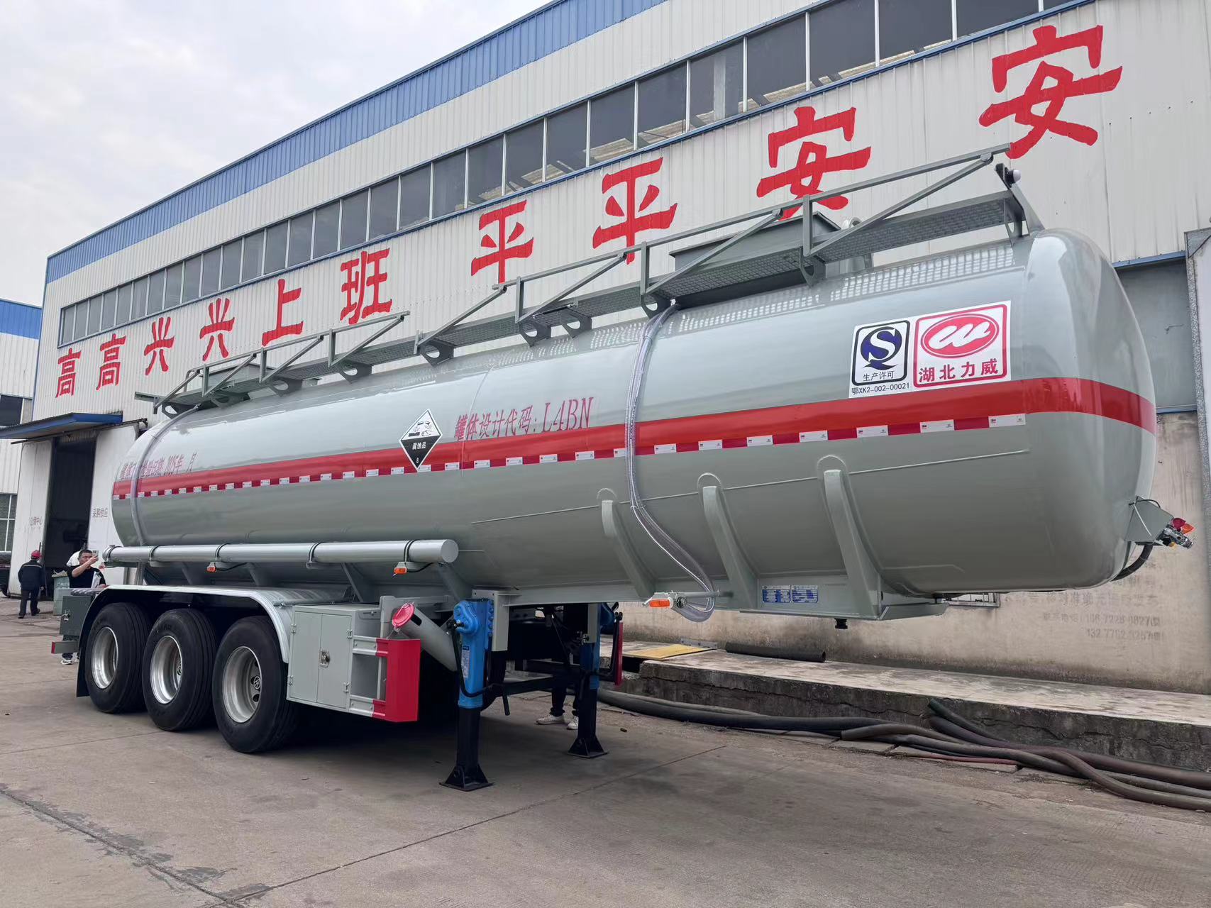 拉鹽酸專用分體式腐蝕品罐式車罐體總?cè)萘?28.19立方,額定載質(zhì)量31150KG,外罐體材質(zhì)為Q235B型4.2mm厚板材,封頭4.5mm厚,罐體通倉,內(nèi)襯20mm厚聚乙烯,三道雙層鋼襯塑防浪板,兩個鋁合金歐標(biāo)罐口蓋,罐口周圍用方盒子式圍邊,圍板內(nèi)做防腐處理,罐體頂部帶活動舉升護(hù)欄,玻璃鋼方格走道,罐體尾底部帶一個DN100不銹鋼襯氟海底閥(海底閥帶聲光報警裝置),罐體后尾部左右各一個DN80襯氟球閥為出料口帶全塑保護(hù)箱,大梁下出料,一個工具箱,尾部爬梯。兩根卸料管,兩個8KG滅火器,其余標(biāo)配。