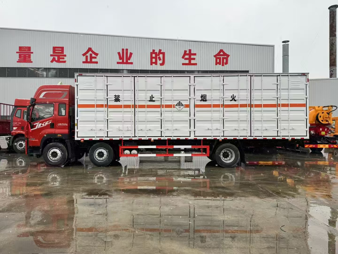 解放JK6三軸帶左右開門危險(xiǎn)品車選用的是白色的涂裝,搭配醒目的紅色條紋,還有“煙火”字樣,這表明它是專門用來運(yùn)輸煙花爆竹等危險(xiǎn)貨物的專用車。這種車輛在安全設(shè)計(jì)上可是下足了功夫,貨廂的材質(zhì)堅(jiān)固,具備良好的防火、防爆性能,而且結(jié)構(gòu)設(shè)計(jì)合理,能夠確保貨物在運(yùn)輸過程中的穩(wěn)定性和安全性。箱體選用的是左右開門,裝貨更方便。貨箱尺寸可選9米6、8米6或者7米7。尾部可加裝液壓尾板。