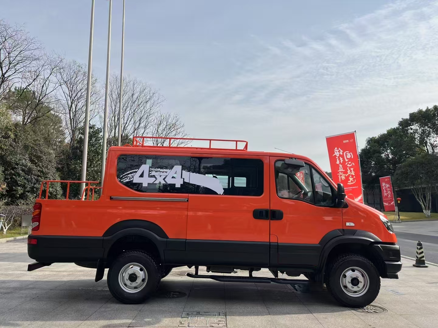 依維柯國六油田專用工具車采用的是歐霸雷霆四驅越野9座工程車,搭載升級版F1CE8481M發動機,132KW/180馬力,430N.m,軍工級電控全時四驅、電控換擋、 110L大容積油箱、主駕標配懸浮座椅、主副安全氣囊、預留后脫鉤橫梁,不選裝涉水喉理論涉水深度850mm,實際可達到1.1, LT265/75R16,爬坡度:軍標級60%。選裝爆胎應急安全裝置、360全景環視、駕駛員疲勞監測、BSD盲區監測、 前方碰撞預警(集成行人碰撞)、流媒體后視鏡、ACC自適應巡航、AEBS、LDWS。