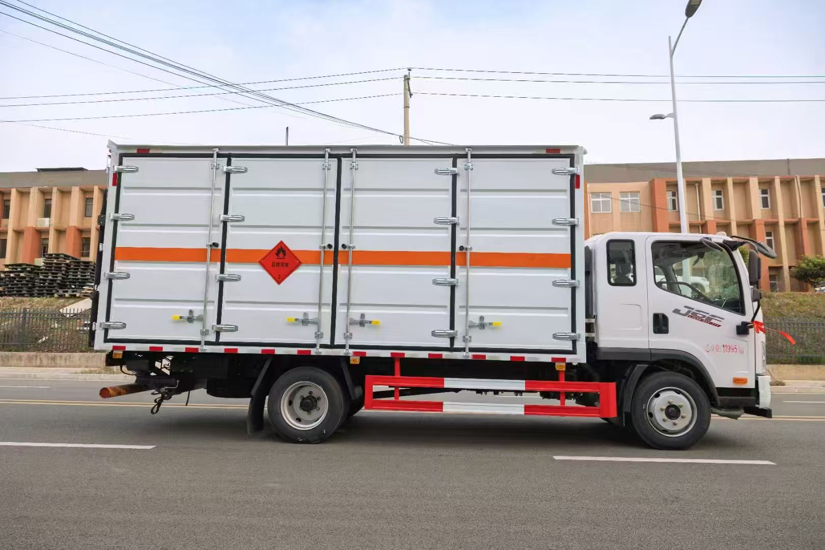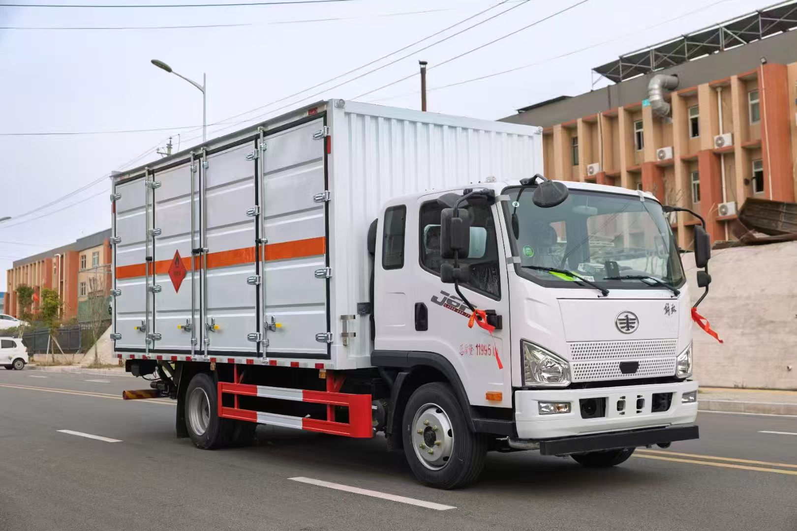 解放J6F帶全開門易燃液體廂式車采用的是危險(xiǎn)品專用底盤,J6F(2010)單排駕駛室,大柴CA4DD2-18E6,陜齒8JS75C,325GH后橋(6噸后橋,16L尿素箱,帶國(guó)產(chǎn)ABS,液晶儀表,電加熱后視鏡,150L鋁合金油箱,板簧7/10+4,高架箱,空調(diào)+電動(dòng)門窗+中控鎖,前后橫向穩(wěn)定桿,后處理器前置+排氣火花熄滅器+前盤后鼓制動(dòng)器+限速79KM/H+前碰撞預(yù)警+車道偏離輔助預(yù)警,北斗+GPRS行車記錄儀,帶靜電拖地帶,爆胎應(yīng)急安全裝置,;瘜S玫妆P。整車尺寸 7100×2550×3270(mm),廂體尺寸 5200X2400x2100。額載噸位7噸,裝貨多不容易超載。采用瓦楞板箱體,底板為4mm花紋板上鋪防靜電膠皮,廂體右側(cè)全部開門。底部橫梁加密25左右,門框帶防盜報(bào)警器,頂部帶煙霧報(bào)警器。其他按標(biāo)配制作,配備隨車工具。