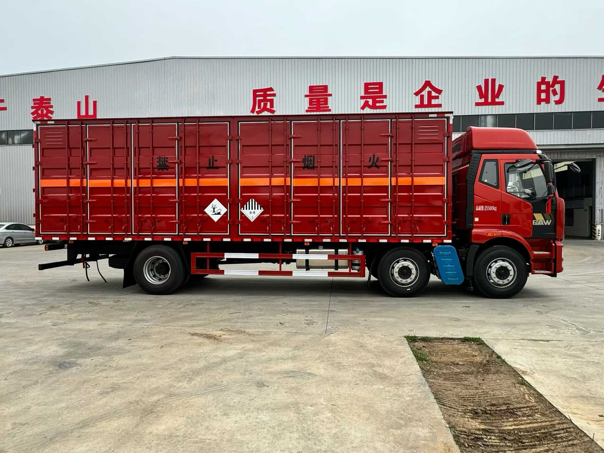 解放J6L前四后八四開門危險品車選用的是時尚的外形,高頂雙臥的駕駛室,上下臥鋪寬敞,重點是針對長途運輸,該款車型駕乘非常舒適。采用新 J6L 全浮高頂排半駕駛室,具備較好的舒適性和空間表現(xiàn)。配備液晶儀表,方便駕駛員讀取車輛信息;支持電動玻璃升降、電動后視鏡 ,操作便捷;設(shè)有后圍窗簾導(dǎo)軌、全景窗簾導(dǎo)軌,提升駕駛室內(nèi)的遮光隱私性;駕駛員座椅為空氣減振座椅,能有效緩解駕駛過程中的顛簸感,減輕駕駛疲勞。此外,還帶有單 DIN 北斗兼容車載系統(tǒng)、電源總開關(guān)控制開關(guān)等配置。廂體為雙層金屬骨架結(jié)構(gòu),外部為冷扎鋼板,具有較好的強度和防護性;內(nèi)壁采用鋁合金板蒙面,夾層填充隔熱阻燃料,起到隔熱、防火的作用。如需安裝抗暴容器則增開側(cè)門,側(cè)壁設(shè)有防雨功能自然通風(fēng)窗,保證廂內(nèi)空氣流通,同時防止雨水進入。底部鋪有阻燃導(dǎo)靜電膠板,可及時導(dǎo)走靜電,避免靜電引發(fā)危險。貨箱尺寸:9600*2450*2700mm。廂體內(nèi)部前面和側(cè)面裝有固定拉環(huán),與捆綁帶配合使用,固定貨物,避免貨物在運輸過程中移動。安裝感煙報警器,感測車廂內(nèi)火情,當(dāng)有火情煙霧出現(xiàn)時,在駕駛室進行蜂鳴報警;門器框上方安裝防盜報警器(可根據(jù)用戶要求選裝防盜監(jiān)視器 ),廂門被打開時,駕駛室內(nèi)的蜂鳴器發(fā)出報警音,不使用時可關(guān)閉駕駛室內(nèi)的控制開關(guān),保障運輸過程中貨物的安全。