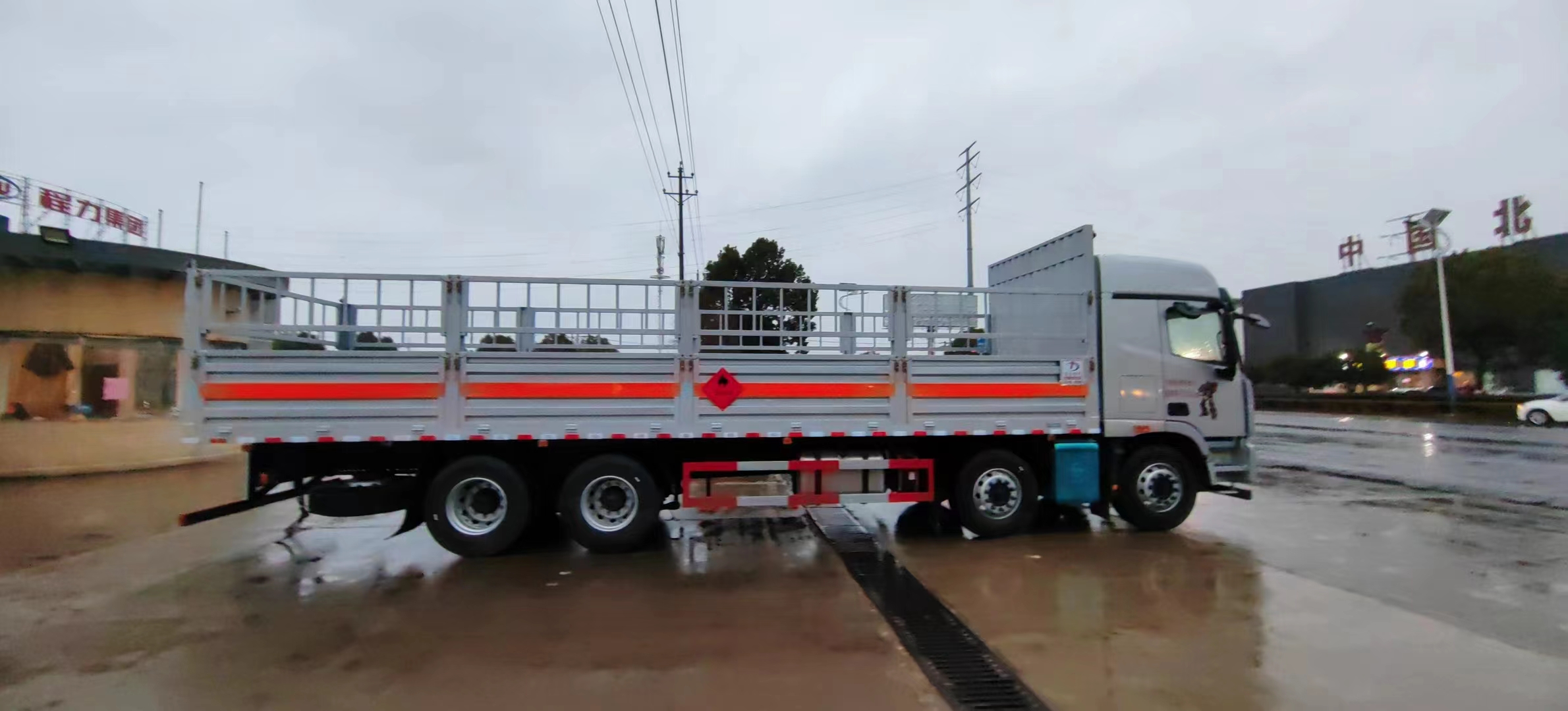 該車為危險(xiǎn)品運(yùn)輸車.箱體選裝柵欄樣式,無柵欄樣式,選裝后部樣式.該車用于運(yùn)輸獨(dú)立容器(瓶)包裝的氣體氣瓶.類項(xiàng)號2.1,2.2.選掛2.1類易燃?xì)怏w標(biāo)志牌或2.2類非易燃無毒氣體標(biāo)志牌.后部安裝液壓尾板,液壓尾板收起水平長度:300mm,尾板質(zhì)量為550kg.側(cè)、后防護(hù)材料為Q235,連接方式:焊接連接,后防護(hù)截面高120mm,截面寬50mm,下邊緣離地高490mm.選裝后部不帶尾板時(shí),后防護(hù)裝置材料:Q235,連接方式為焊接,后防護(hù)截面高120mm,截面寬50mm,下邊緣離地高490mm.僅采用排氣管前置,子午胎,限速裝置,輔助制動(dòng)裝置和前盤制動(dòng)器的底盤;限速80km/h. |