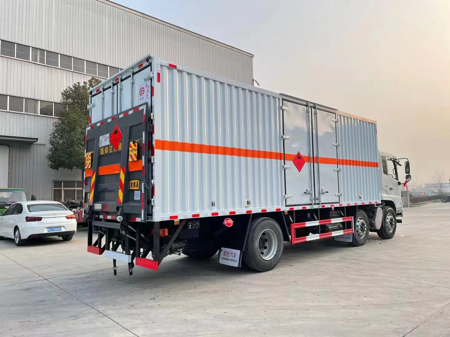 | 專用功能說明 | 1、該車為危險品運輸車.運輸具有**容器(瓶)包裝的易燃液體物品.運送危險物品類項號:3類.廂體頂部封閉不可開啟.2、側,后防護材料均為Q235,側方護螺栓連接,后防護焊接,后防護截面尺寸(mm)120×60,下邊緣離地高490mm.3、僅選用排氣管前置、限速裝置(限速80km/h)、前輪盤式制動及子午線輪胎的底盤,轉向輪安裝輪胎爆胎應急防護裝置.后軸采用空氣懸架.安裝帶有衛(wèi)星定位功能的行駛記錄儀.EBS型號/廠家:EBS5/東科克諾爾商用車制動系統(tǒng)(十堰)有限公司.發(fā)動機/油耗值(L/100km)對應關系為:B6.2NS6B230/36.1,B6.2NS6B245/36.1.整車長度/軸距/后懸對應關系為(mm):10180/1995+4200/2555,11080/1995+5000/2655.隨底盤選裝駕室.該車型可選裝ETC車載裝置.廂體側面選裝開門型式及位置,選裝不帶側開門,選裝貨廂平面或瓦楞結構;廂體側面板選裝開百葉窗,選裝后部樣式.選裝尾板,尾板質(zhì)量為550kg,尾板收起狀態(tài)水平長度為290mm。選裝制冷機組,選裝后處理隔熱罩。 | ||