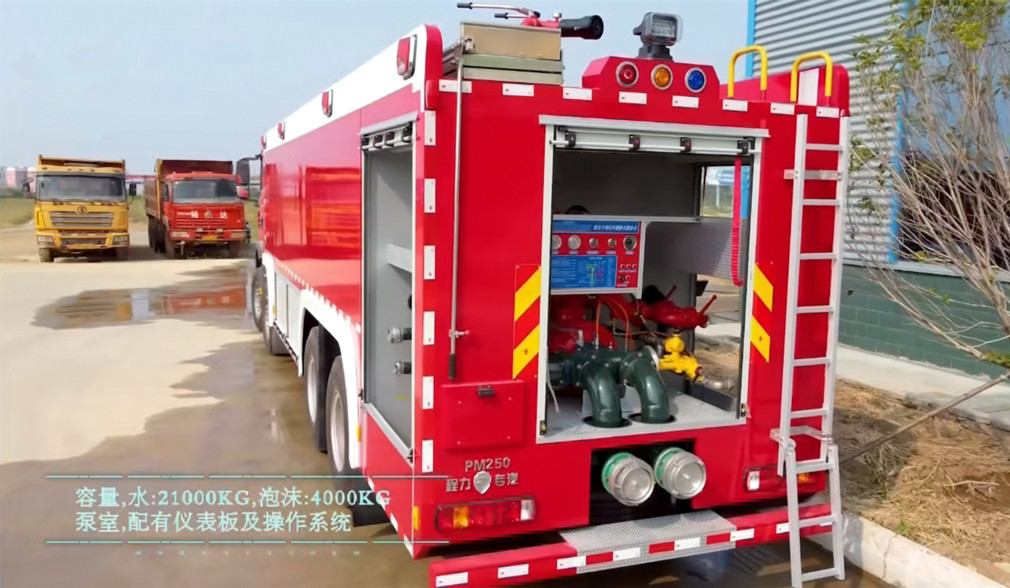 重汽豪沃前四后八國六水罐、泡沫消防車水泵設有Φ150mm進水口,可從天然水源、液罐、消防蓄水池 吸水,另可加轉換異徑接口連接消防栓吸水供水,吸水管放置于車頂。1 個 帶Φ150mm 蝶閥的進水口,用于與水罐相連接。車頂配有火場照明燈 1 只;車輛兩側下方設有安全標志燈,車身、尾部 按標準粘貼反光標識。所有器材箱均安裝 LED 照明燈,方便夜間作戰照明之用。車輛兩側上方各配有三盞爆閃燈與側照明燈 (組合式),下方安裝安全標 識燈和側回復反射器 (組合式),配有前、后示廓燈,兩側各一只轉向燈,乘員 室、器材箱、泵房內均有照明燈。